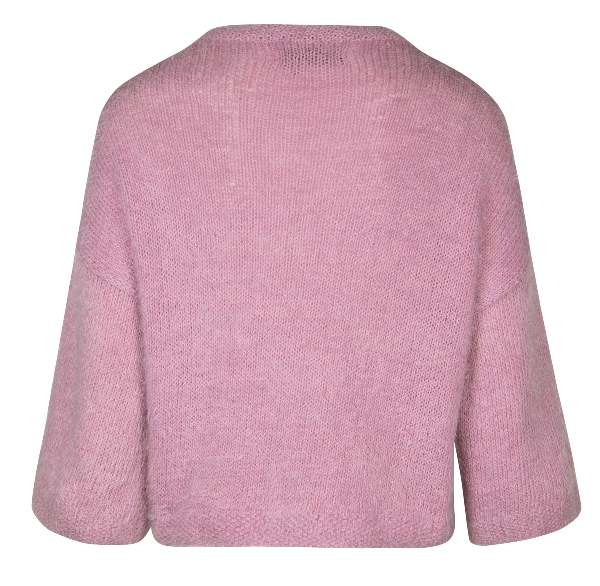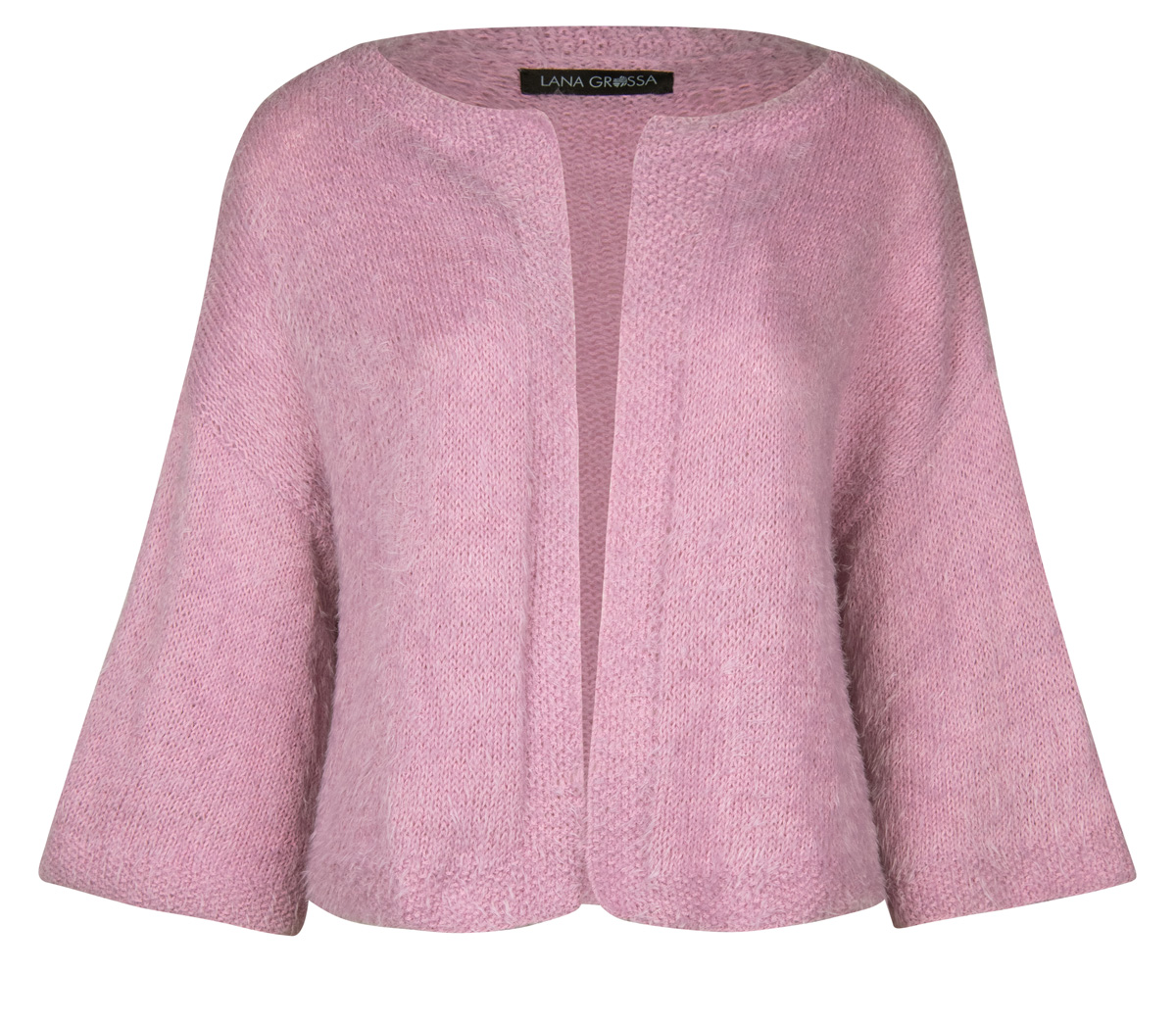 Lana Grossa-Qualität „Per Fortuna” (74 % орг. хлопок, 26 % полиамид, длина нити = ca. 190 m/50 g): ок. 300 (350 – 400) г сирень (цв. 5); сп. № 4 и 4,5, 1 кр. сп. № 4, длиной 80 см.