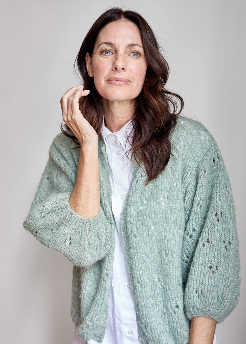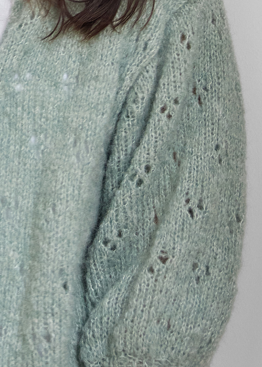 Lana Grossa Più Bella (59% (беби) альпака, 20% полиамид, 15% кашемир, 6% шерсть (меринос), длина нити 100 m/25 g), 175 (200–225) г серо зелёный (цв 8); сп. № 5 и 5,5 и 1 кр. сп. № 5, 40 см длиной