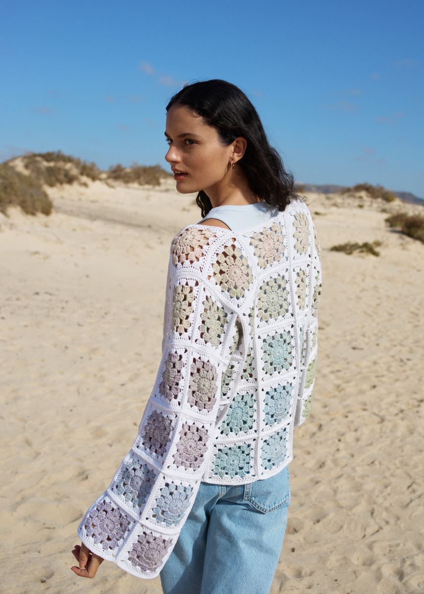 Lana Grossa-Qualität „Promessa” (70 % (био) хлопок, 30 % перераб. полиамид, длина нити = ок. 125 m/50 g): ок. 400 (400–450) г белый (цв. 13) и Lana Grossa-Qualität „Cotonella” (100 % (Pima) хлопок, длина нити = ок. 280 m/100 g): ок. 300 (300–400) г зеленый пастель/пастельный розовый/бежевый/синяя пастель/серо-фиолетовый (цв. 1); 1 крючок № 4.