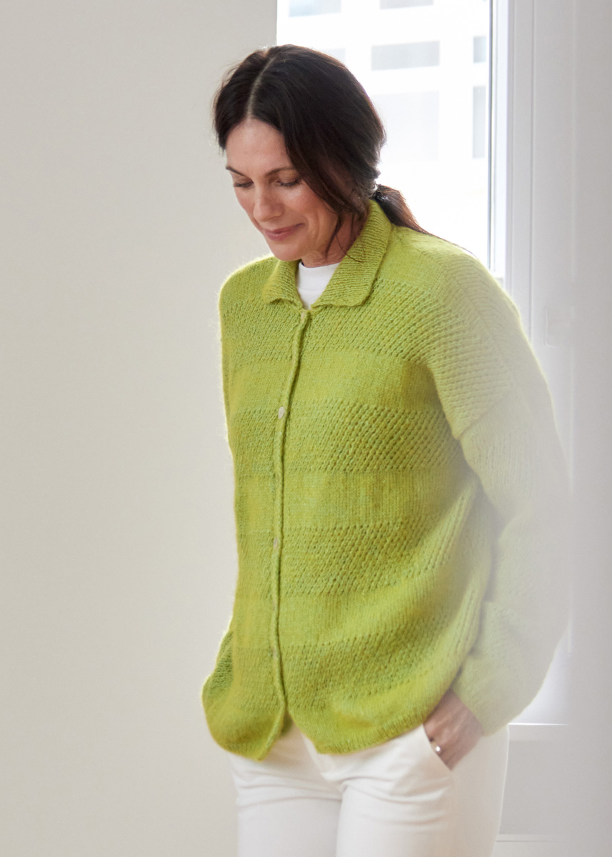 Lana Grossa Puno Due (63% хлопок, 37% альпака (беби), длина нити 210 m/50 g), 400 (450–500) г светло зелёный/жёлтый (цв 18); сп. № 2,5 и 4, 8 пуговицы от UNION KNOPF, Art. 37604, цв 12, размер 15 мм