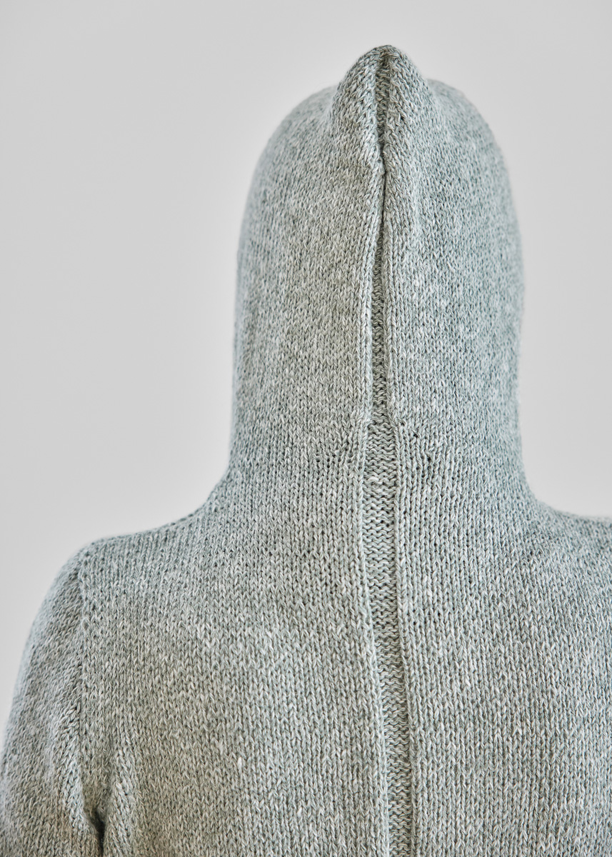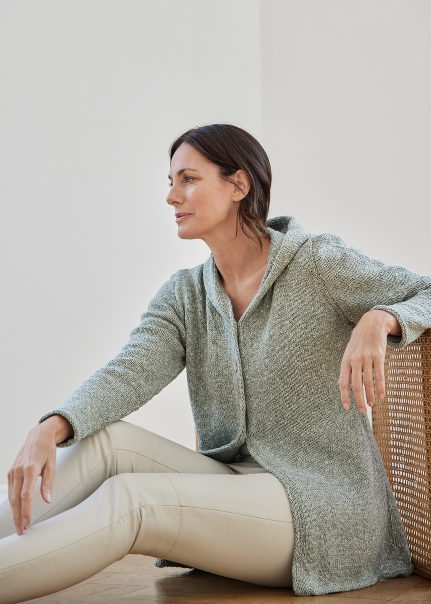 Lana Grossa Cara (57% альпака (беби), 33% хлопок, 10% шерсть (меринос), длина нити 120 m/50 g), 550 (600–650) г серо зелёный (цв 12); сп. № 4,5, 4 пуговицы от UNION KNOPF, Art. 37604, цв. 12, размер 18 мм