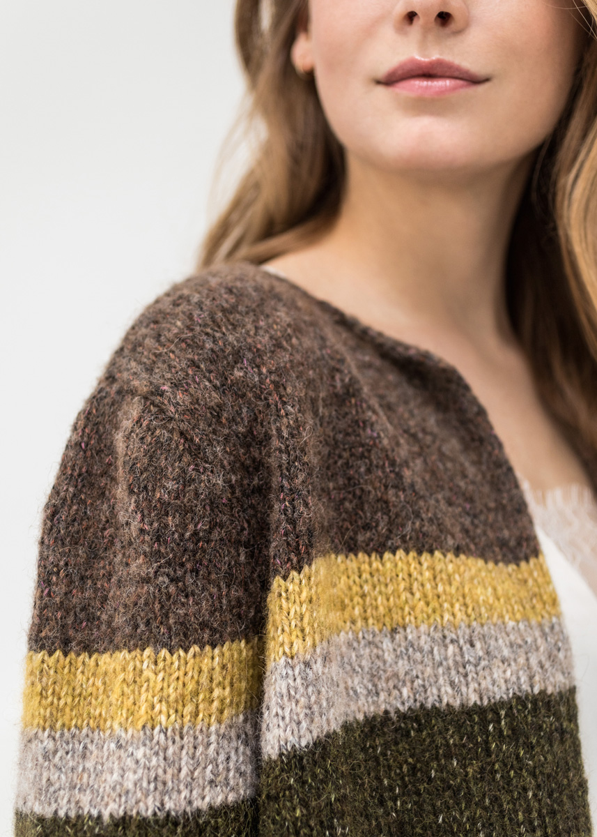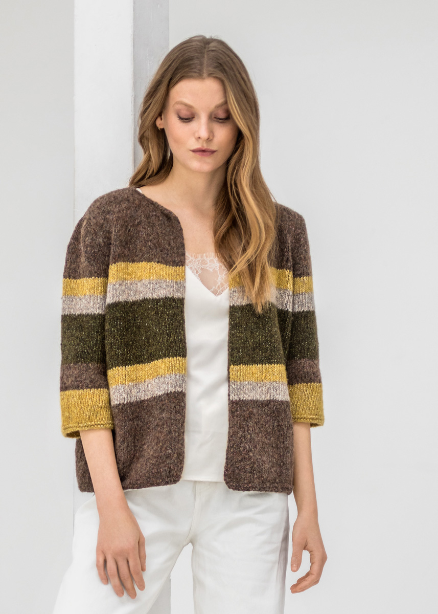 Lana Grossa-Qualität „Sara” (65 % хлопок, 30 % альпака, 5 % меринос, длина нити = ок. 110 m/50 g): ок. 200 (250) г серо-коричневый меланжевый (цв. 5), по. 100 г жёлтый меланжевый (цв. 13) и тёмно-оливковый меланжевый (цв. 14) и. 50 г бежевый меланжевый (цв. 6); сп. № 5,5, 1 крючок № 5