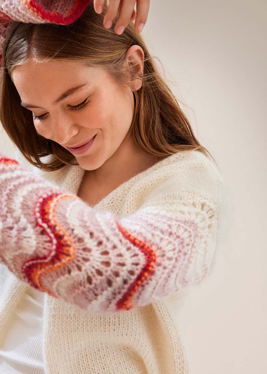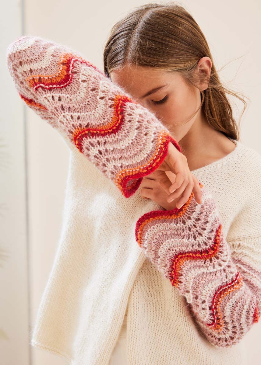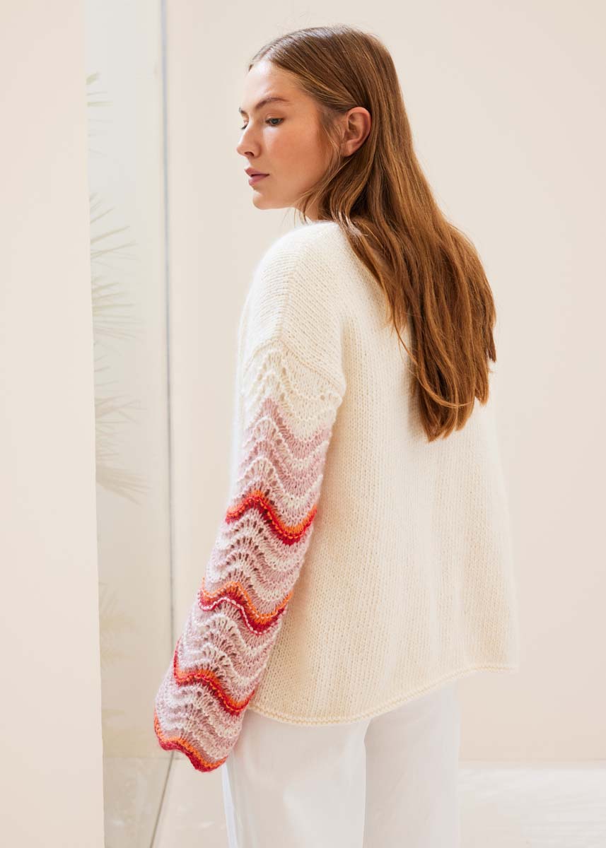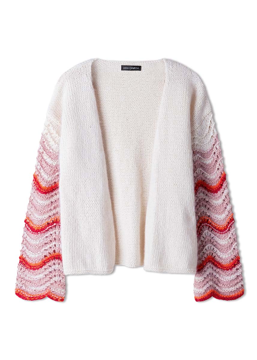 Lana Grossa-Qualität „Silkhair“ (70 % Mohair (Superkid), 30 % шёлк, длина нити = ca 210 m/25 g): ок 25 (25) г красная конфета (цв 198), ок 25 (25) г тыквенный (цв 190), ок 25 (25) г розовый (цв 85) и ок 125 (150) г белый (цв 117); Lana Grossa-Qualität „Summer Softness“ (80 % хлопок (био), 20 % шерсть (меринос суперфейн), длина нити = ca 130 m/50 g): ок 50 (100) г красный (цв 7), ок 50 (100) г тыквенный (цв 6), ок 50 (100) г пастельный розовый (цв 10), ок 350 (450) г кремовый (цв 2); сп. № 6; 1 кр. сп. № 5,5.