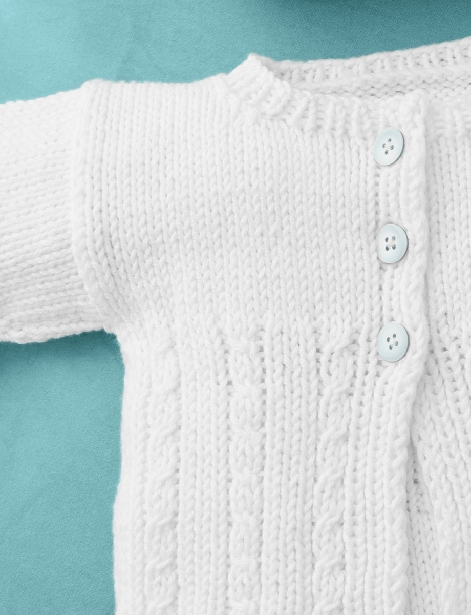 Soft Cotton (70 % хлопок, 30 % полиамид, длина нити 140 m/50 g) 100 г белый (цв 10); спицы № 3,5, кр. спицы № 3,5, длиной 40 см; 3 кнопки 12 мм Ø