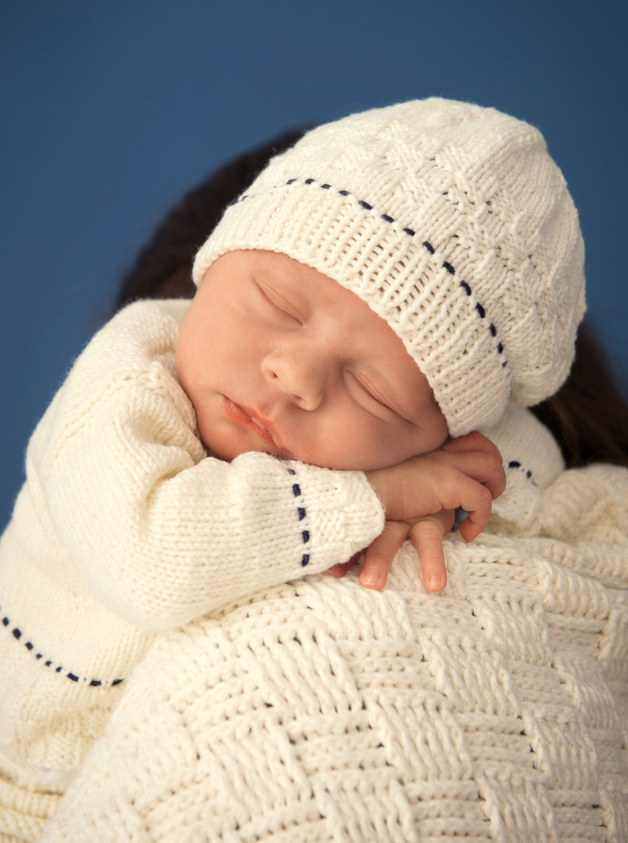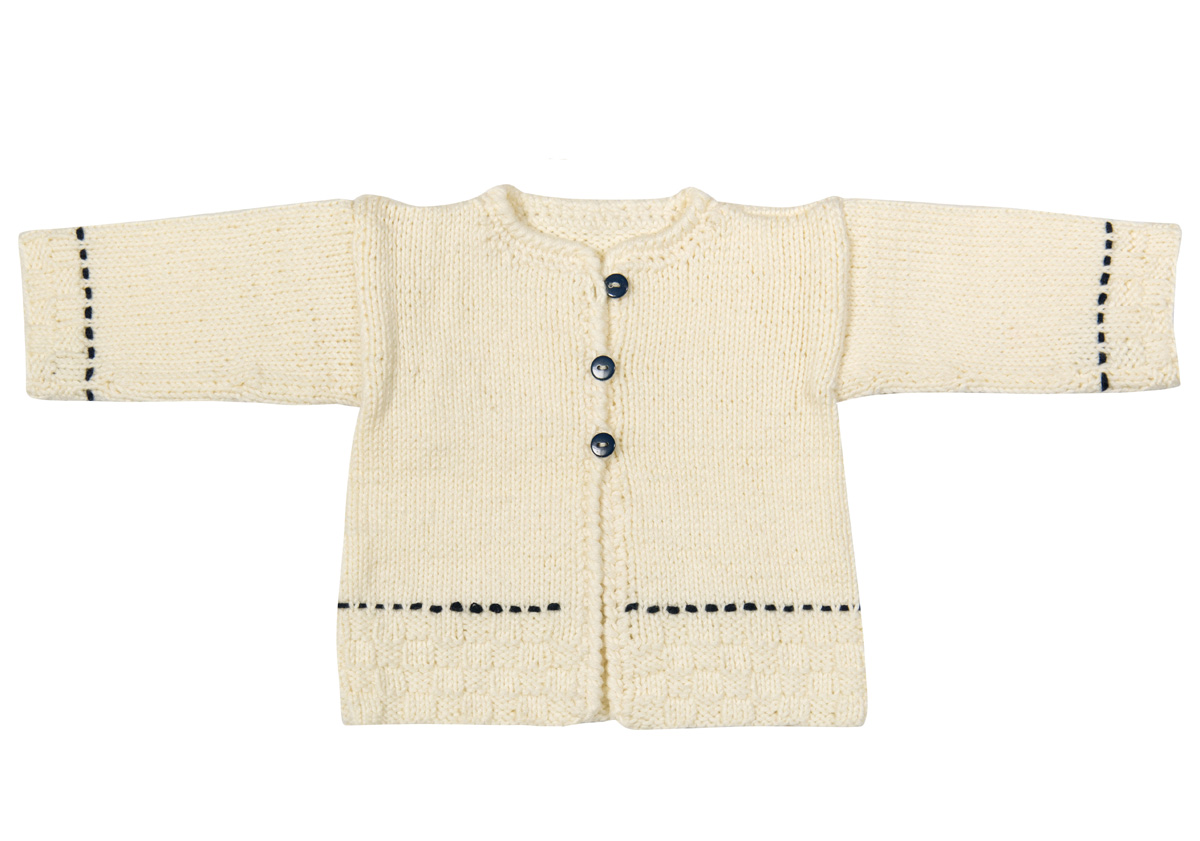 Lana Grossa Soft Cotton (70 % хлопок, 30 % полиакрил, длина нитки 140 m/50 g) 100 (100/150) г экрю (цв 2) и 50 г темно синий (цв 17); сп. № 4, крючок № 3,5; 3 кнопки 9 мм Ø