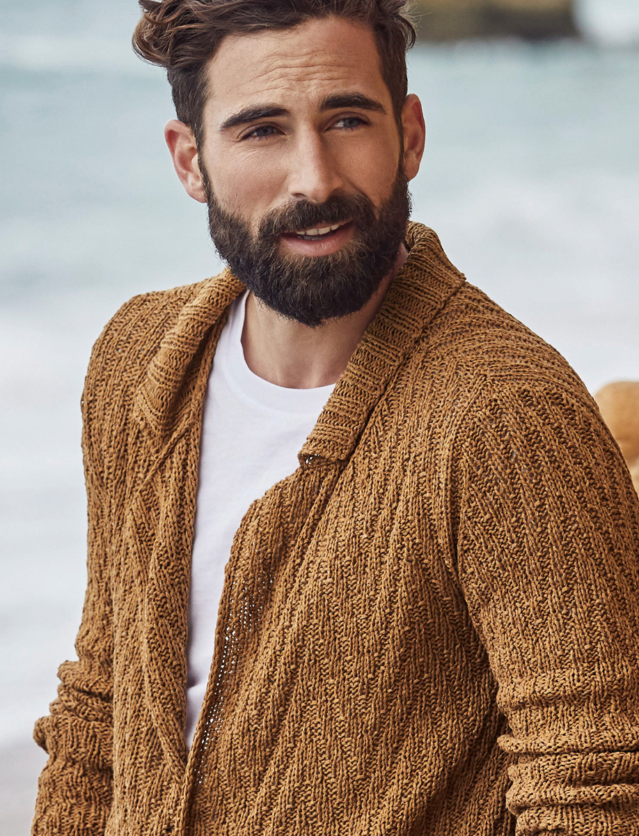 Lana Grossa Solo Lino Mélange (80 % переработанный лён (вискоза), 20 % лён; Длина нити: около 105 m / 50 g), 700 (750 – 800) г цвет корицы меланжевый (цв 122); спицы № 4 и 1 кнопка от UNION KNOPF, Art. 36428, цв. 20, размер 23 мм