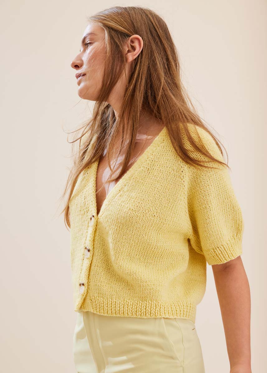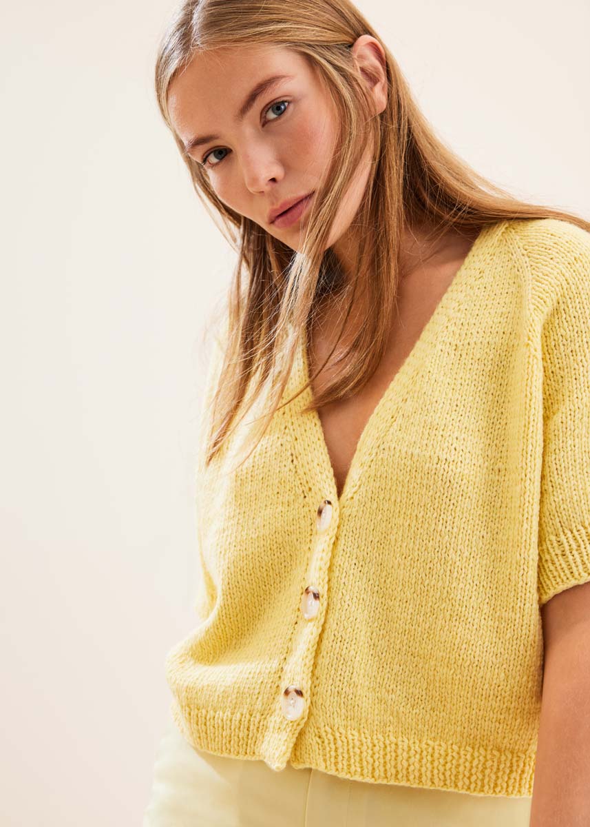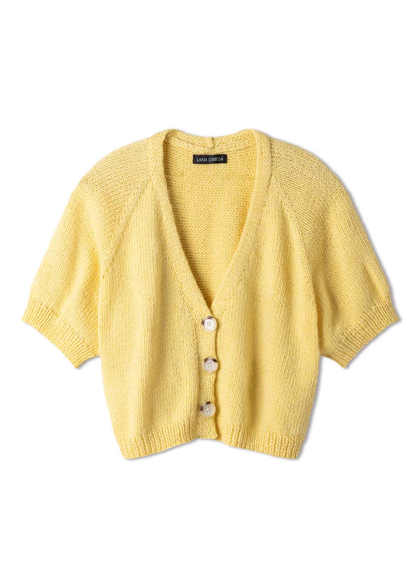 Lana Grossa-Qualität „Summer Softness“ (80 % хлопок (био), 20 % шерсть (меринос суперфейн), длина нити = ca 130 m/50 g): ок 300 (350–350–400) г жёлтый (цв 11); сп. № 4 и 6; 3 пуговицы в бежевом цв., диам. 28 мм, № арт. 454230 от Union Knopf.