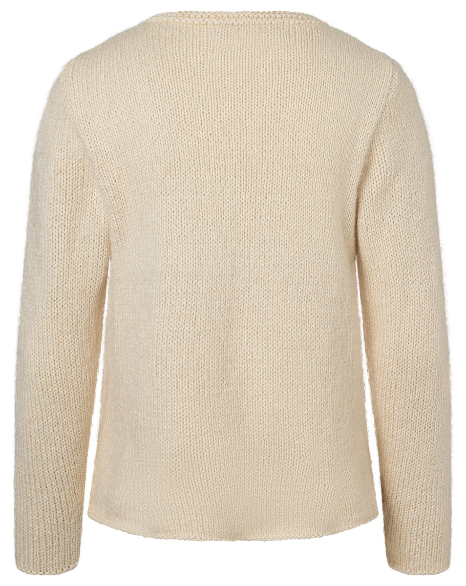 Lana Grossa Alta Moda Cotolana (45% шерсть (меринос), 45% пима хлопок, 10% полиамид, длина нити 150 m/50 g), 350 (400 – 450 – 500) г экрю (цв 20) и Lana Grossa Silkhair (70% мохер, 30% шёлк, длина нити 210 m/25 g), 125 (150 – 150 – 175) г чисто белый (цв 52); сп. № 5 и 1 кр. сп. № 5, длиной 100 см, 1 вспом. сп. и 6 пуговицы от UNION KNOPF, арт. 37604 цв. 12, размер 18 мм
