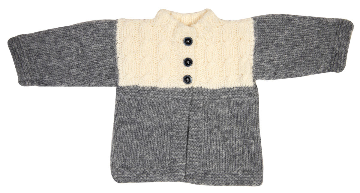 Lana Grossa Cashmere 16 Fine (80 % шерсть, 10 % кашемир, 10 % полиамид, длина нити 320 m/50 g) 50 г светло серый (цв 15) и 50 г чисто белый (цв. 9); сп. № 3, кр. сп. № 3 длиной 40 см; 3 пуговицы 12 мм Ø.