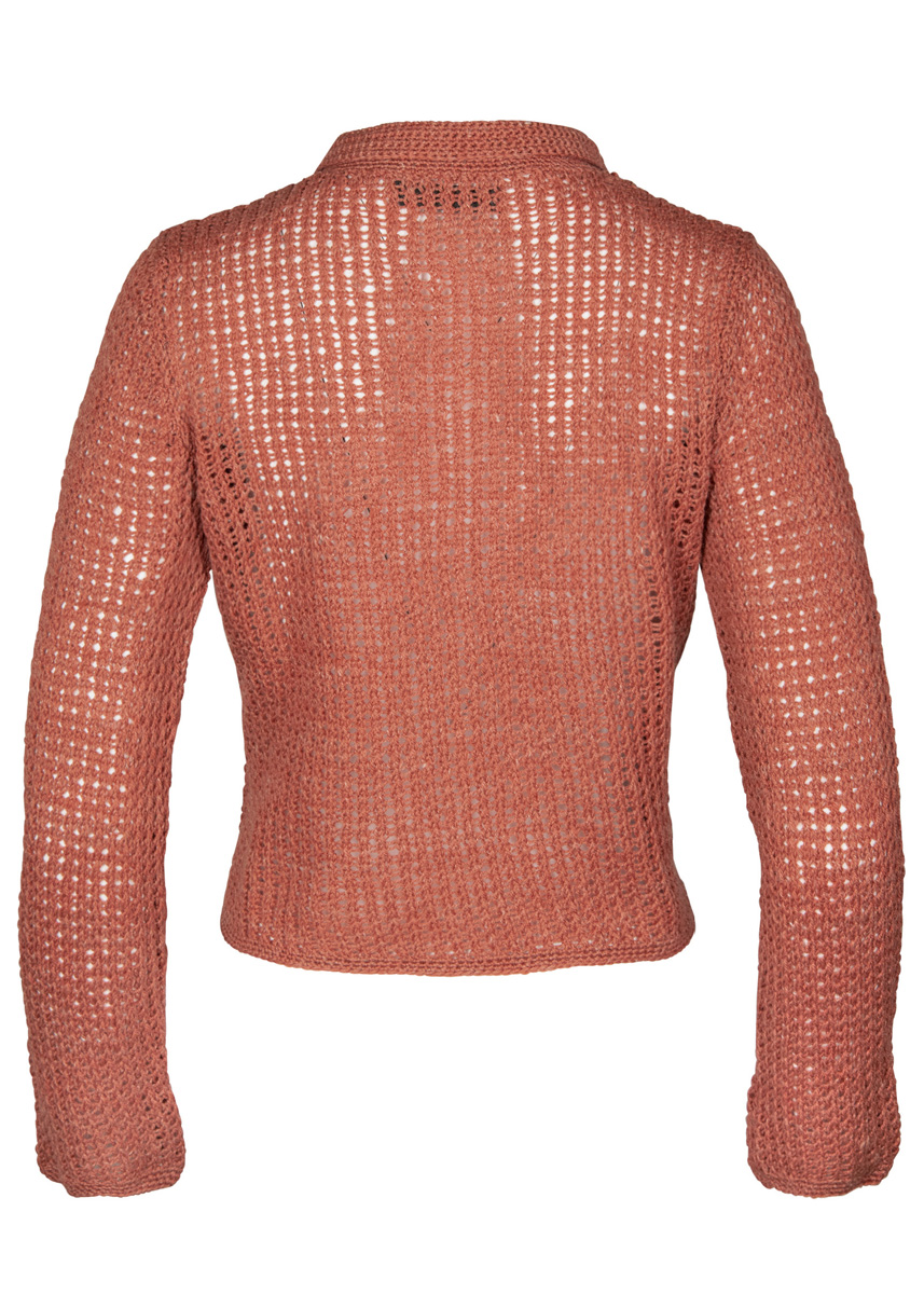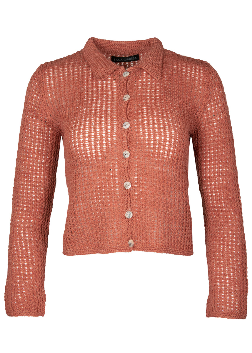 Lana Grossa Cool Wool (100% шерсть, длина нити 160 m/50 g), 400 (450 – 500) г карамель (цв 2054); сп. № 3,5 и 5,5, крючок № 3,5 и 4, 7 пуговицы от UNION KNOPF, арт. 37604, цв. 12, размер 15 мм