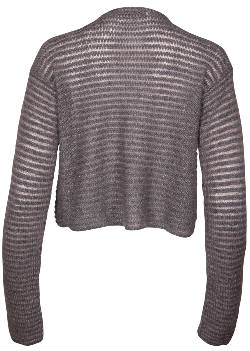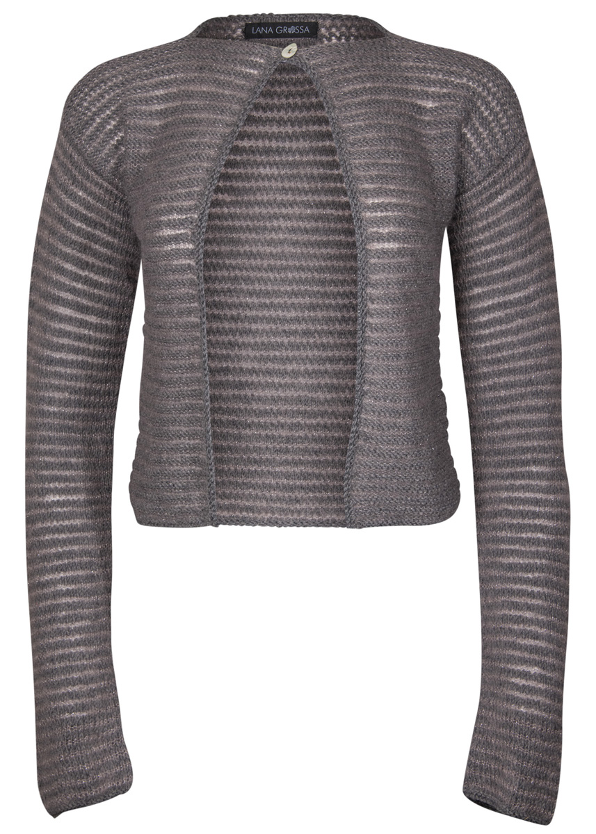 Lana Grossa Cool Wool (100% шерсть, длина нити 160 m/50 g), 200 (250 – 300) г тёмно-серый меланжевый (цв 412) и Lana Grossa Silkhair Lusso (78% мохер, 14% шёлк, 4% полиамид, 4% полиэстер, длина нити 210 m/25 g), 50 (100 – 100) г серо-коричневый (цв 913); сп. № 4 и 1 пуговица от UNION KNOPF, арт. 40795, цв 12, размер 18 мм