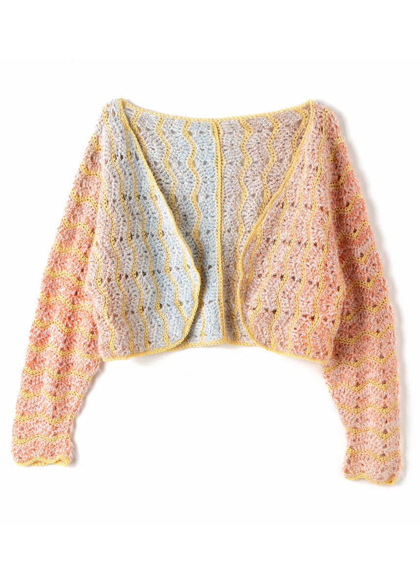 Lana Grossa-Qualität „Gomitolo Sole” (58 % вискоза, 42 % хлопок, длина нити = ок. 760 m/200 g): ок. 400 г крем/бежевый/зеленовато-голубой/серо-коричневый/ лососевый (цв. 927), Lana Grossa-Qualität „Per Fortuna” (74 % (био) хлопок, 26 % полиэстер, длина нити = ок. 190 m/50 g): 200 г экрю (цв. 8) и Lana Grossa-Qualität „Capri” (55 % хлопок, 30 % полиэстер, 15 % шёлк, длина нити = ок. 150 m/50 g): ок. 150 г жёлтый (цв. 35); крючок №. 5,5