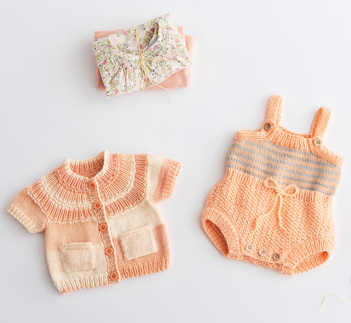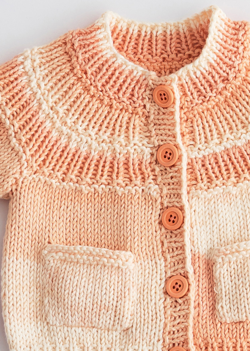 100 (100/150/150) г цвета экрю/розовой/желто-розовой (цв. 102) пряжи Soft Cotton Dégradé (70% хлопка, 30% микрофазерного волокна, 140 м/50 г) фирмы Lana Grossa; прямые спицы № 3,5 и № 4, круговые спицы № 3,5 и № 4 длиной 40 см, пять пуговиц диаметром 14 мм