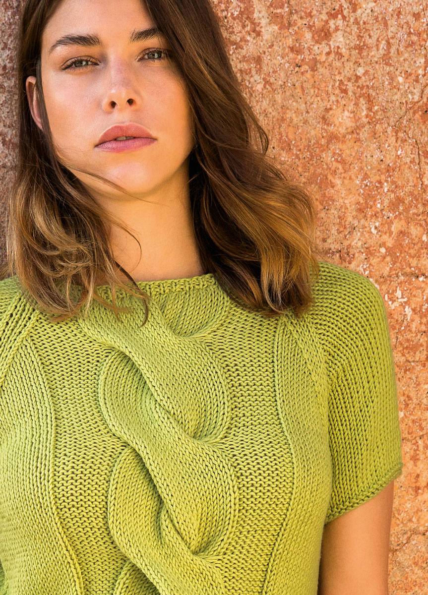 300 (350) г желто-зеленой (цвет 91) пряжи Organico фирмы Lana Grossa (100 % биологически чистого хлопка, 90 м/50 г); прямые спицы № 4,5 и 5,5, круговые спицы № 4,5 длиной 40 см