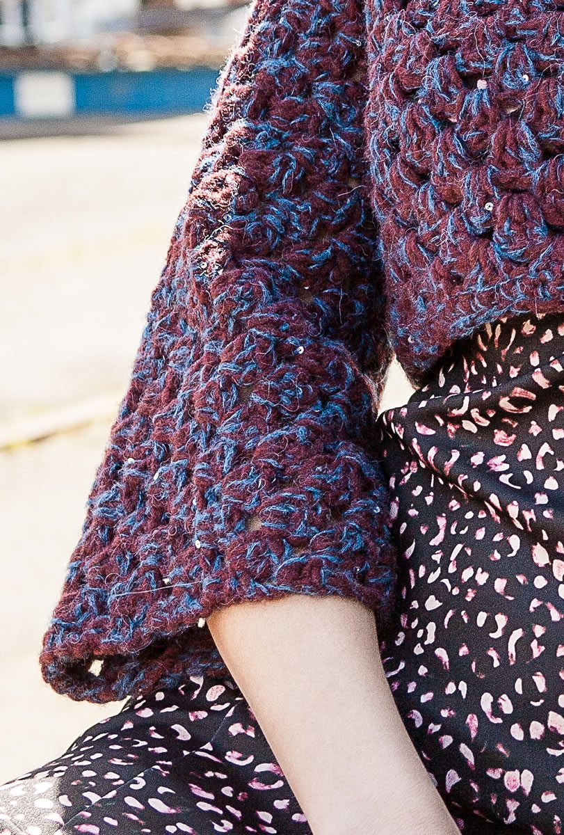 300 г бургундской меланжевой (цвет 4) пряжи Yak Merino фирмы Lana Grossa (20 % шерсти яка, 30 % шерсти мерино, 28 % бэби альпака, 22 % полиамида, 110 м/50 г) и 125 г темно-синей (цвет 10) пряжи Lace Paillettes фирмы Lana Grossa (45 % альпака, 20 % шерсти, 15 % хлопка, 15 % полиамида, 5% полиэстера, 150 м/25 г); крючок № 7.