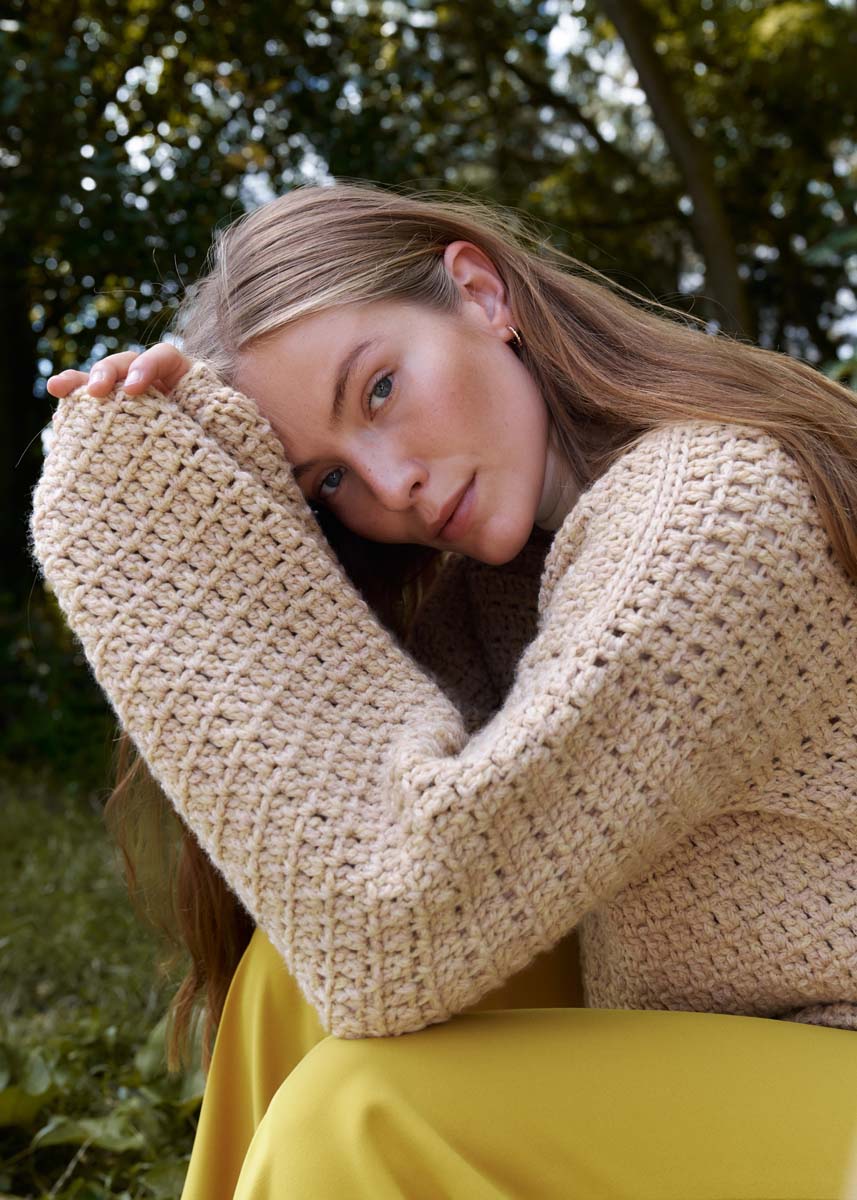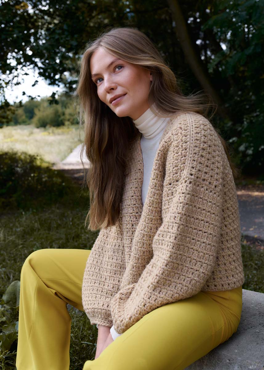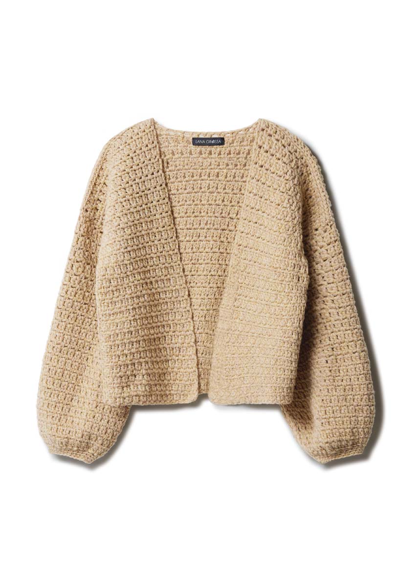 650 (700–750) г бежевой (цв. 223) пряжи Cool Merino Big (90% шерсти мерино, 10% полиамида, 90 м/50 г) фирмы Lana Grossa; крючок № 7.