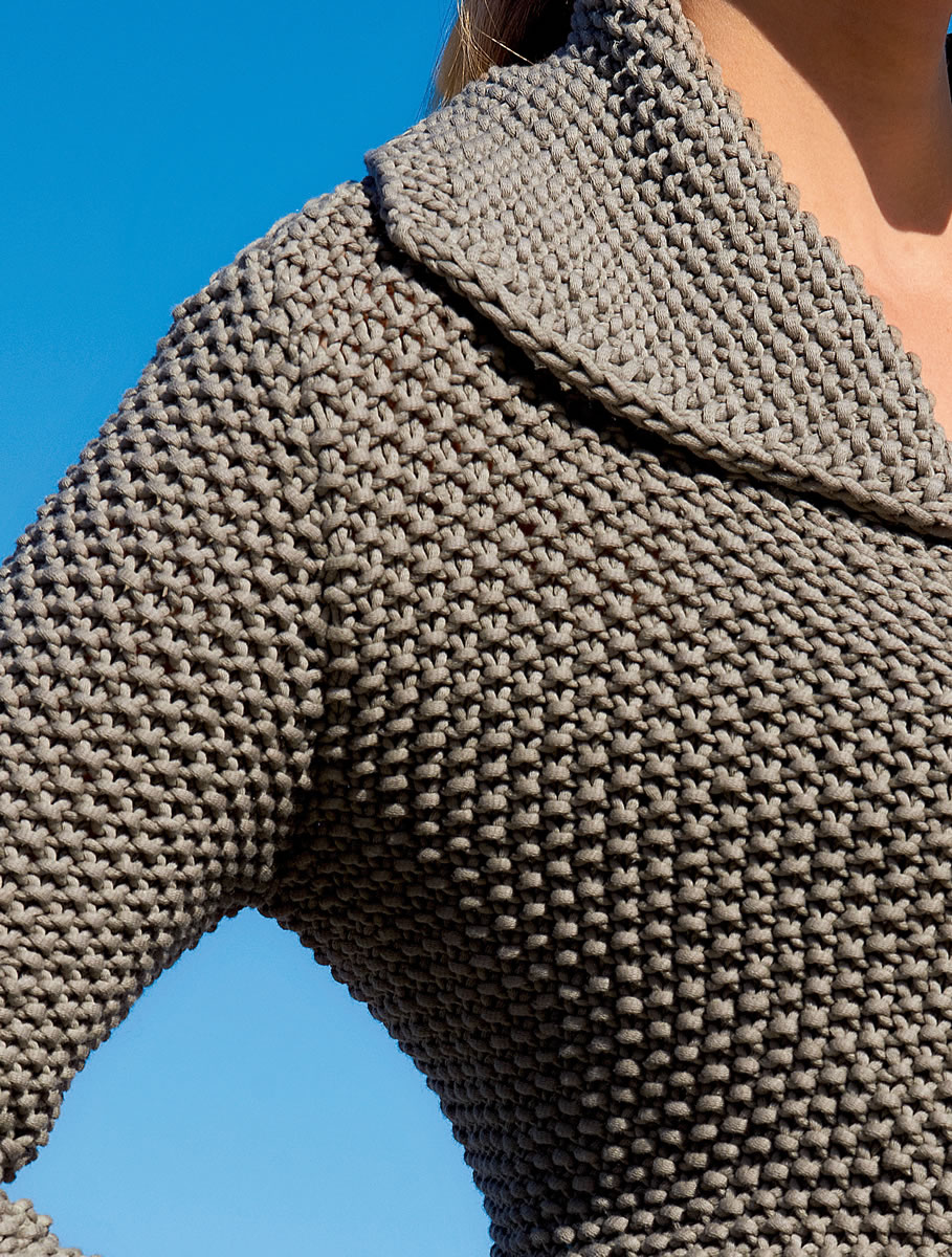 450 (500) г серо-коричневой (цвет 14) пряжи Cotofine фирмы Lana Grossa (70% хлопка, 30% полиамида, 90 м/50 г); прямые спицы № 7 и № 8, круговые спицы № 7 и № 8 длиной 80 см, вязальный крючок № 7; блестящая пуговица фирмы Union Knopf, арт. 451019, Ø5 мм, цвет 10 прозрачный/серебристый.
