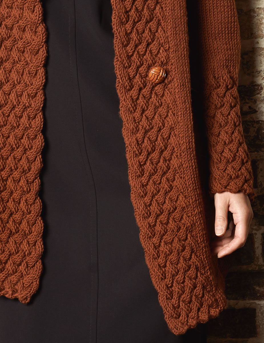 И снова вязаное пальто. Благородный оттенок коньяка и декоративный плетеный узор. Уютно от одного взгляда. Пожалуй, именно этого так хочется в холодное время года.