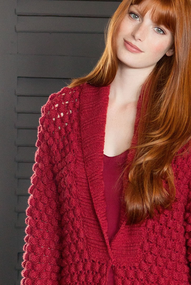 950 (1000) г темно-красной (цв. 10) пряжи Alta Moda Cashmere 16 (78% овечьей (мериносовой) шерсти, 12% кашемира, 10% полиамида, 110 м/50 г) фирмы Lana Grossa; прямые спицы № 6,5 и № 7, круговые спицы № 6,5 длиной 100 см.