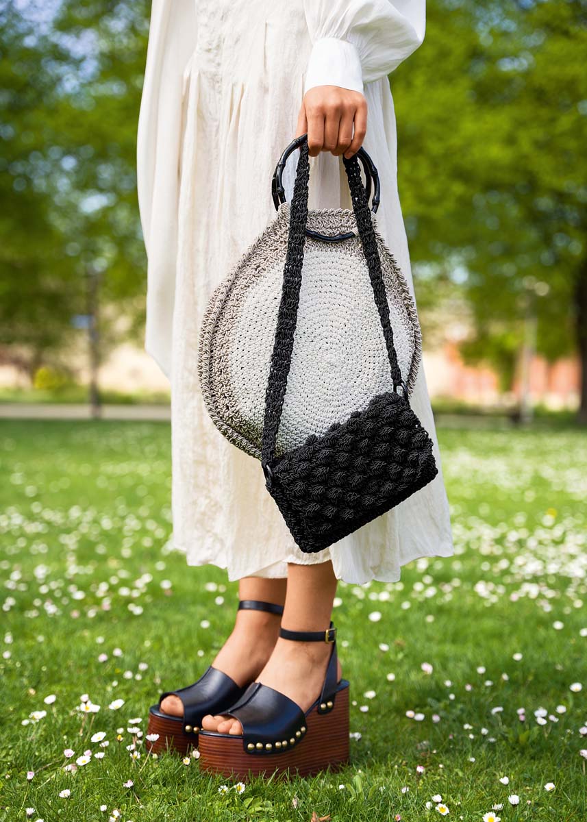 Lana Grossa The Core (50 % хлопок, 50 % полиэстер, длина нитки 85 m/100 g), 300 г белый (цв 1) и 100 г серо бежевый (цв 5); крючок № 4,5-5, 6,0 и 7,0; 2 ручки из бамбука, диам. 15 cm; 1 маркировка
