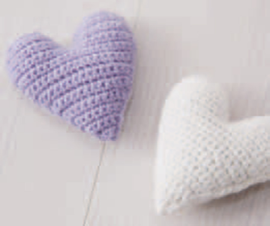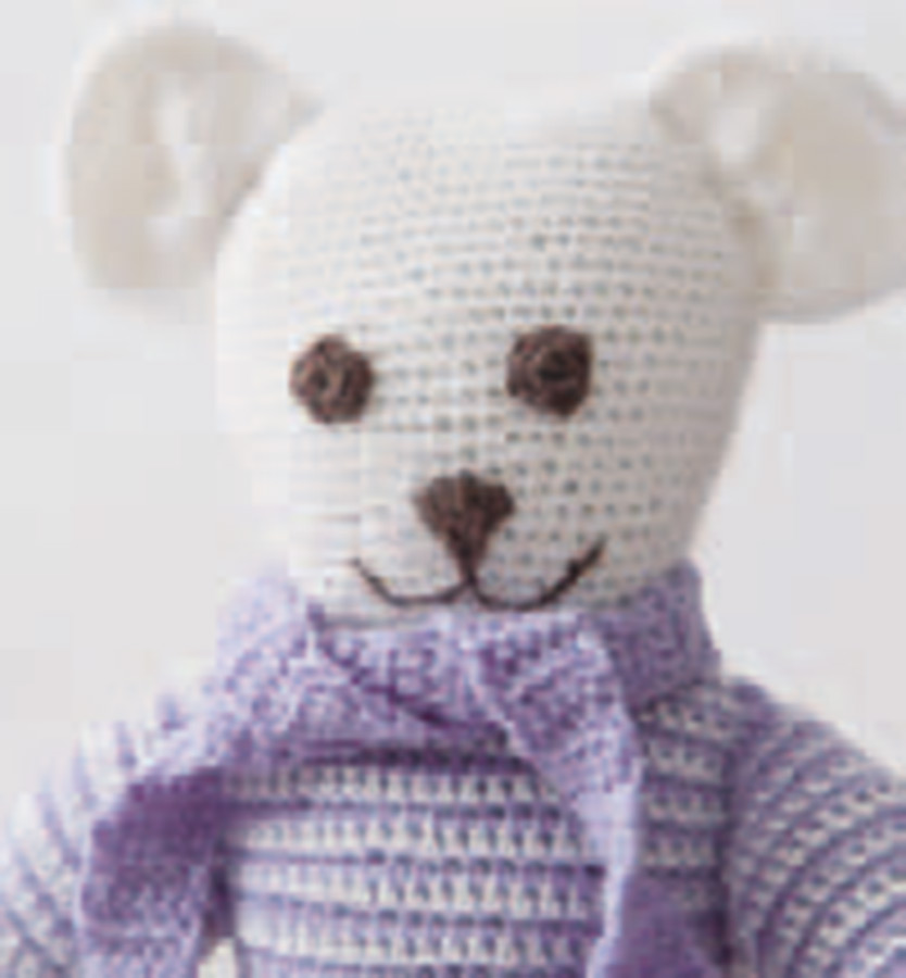 по 50 г лиловой (цв. 215) и белой (цв. 207), а также остатки коричневой (цв. 211) пряжи Cool Wool Baby (100% мягкой мериносовой шерсти, 220 м/50 г) фирмы Lana Grossa; крючок № 2,5; ватка для набивки