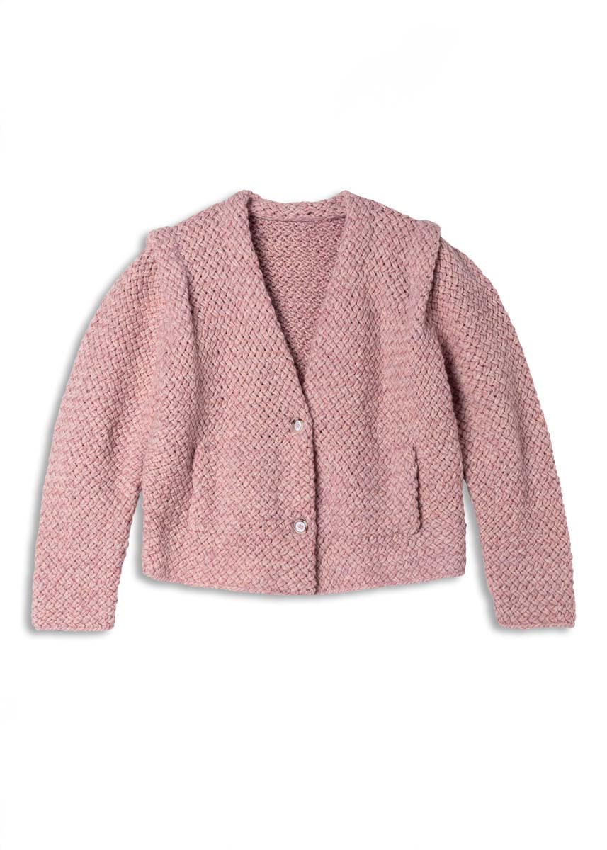 650 (700–750) г цвета увядшей розовой розы (цв. 6) пряжи Lala Berlin Lovely Cotton (75% шерсти мерино суперфайн, 25% хлопка, 90 м/50 г) фирмы Lana Grossa; прямые спицы № 8; 2 светло-бежевые пуговицы диаметром 23 мм.