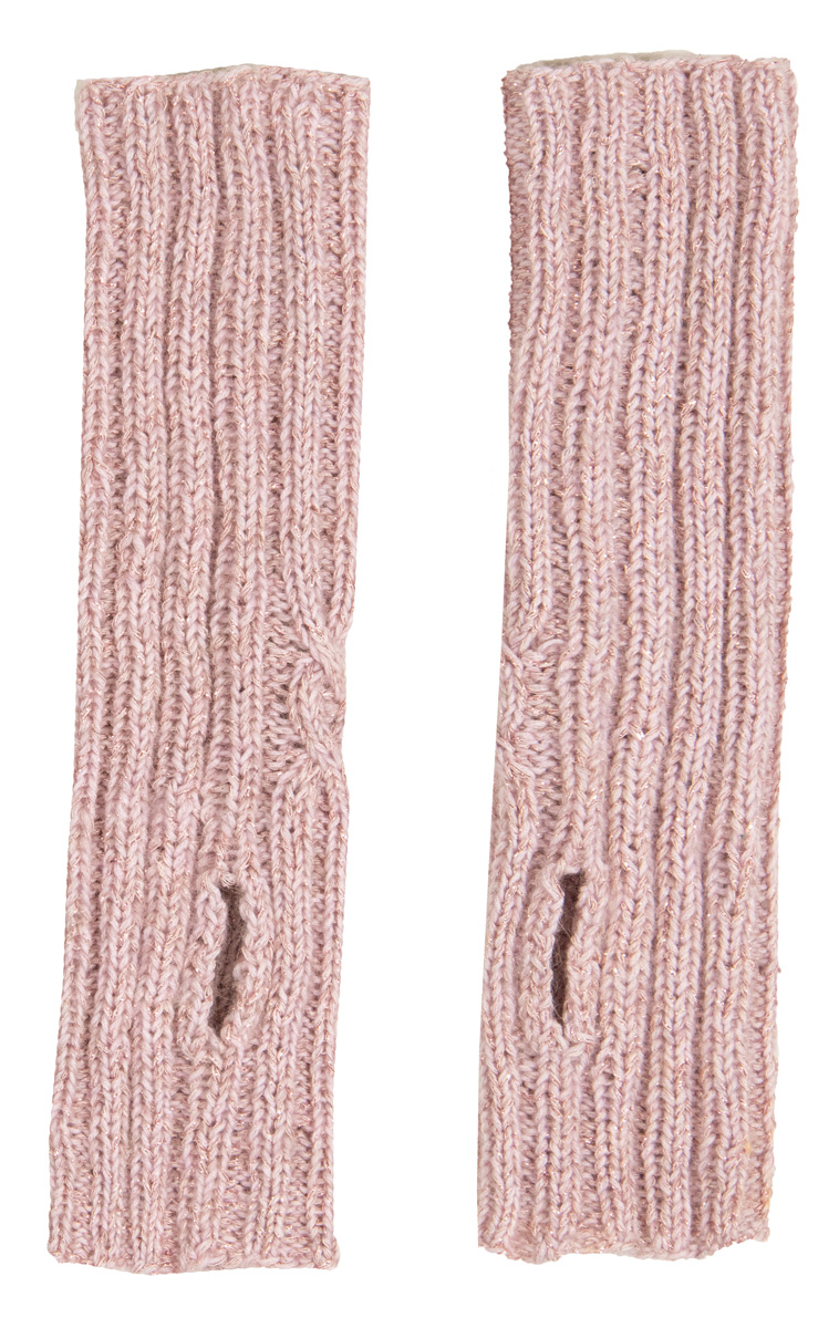 Lana Grossa „Ecopuno“ (72% хлопок, 17% шерсть (меринос), 11% альпака; длина нити 215 m/50 g), 50 г сирень (цв 8) и Lana Grossa „Brillino“ (83% вискоза, 17% металл. Фибра, длина нити 200 m/25 g), 25 г белый/розовый (цв 8); чул. сп. № 3,0