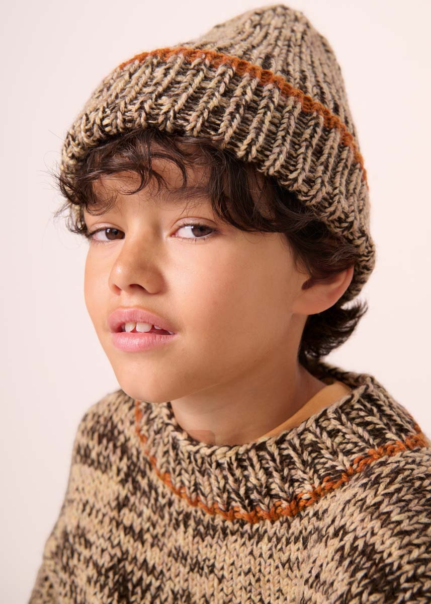 150 (150–200–200) г черно-коричневой (цв. 212) пряжи Ecopuno (72% хлопка, 17% шерсти мерино, 11% альпака бэби, 215 м/50 г), 250 (250– 300–300) г светло-бежевой (цв. 23) пряжи Cool Merino (90% шерсти мерино, 10% полиамида, 150 м/50 г) и 50 (50– 50–50) г цвета ржавчины (цв. 213) пряжи Cool Merino Big (90% шерсти мерино, 10% полиамида, 90 м/50 г) фирмы Lana Grossa; прямые спицы № 4,5 и № 5, короткие круговые спицы № 4,5.