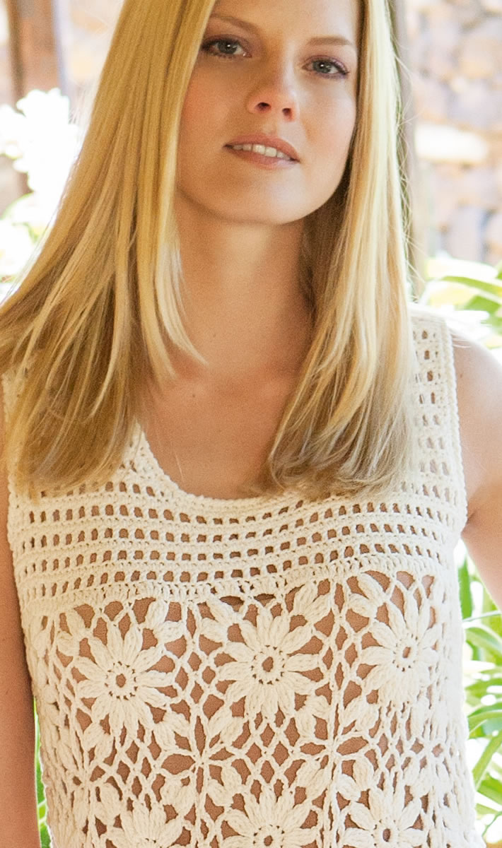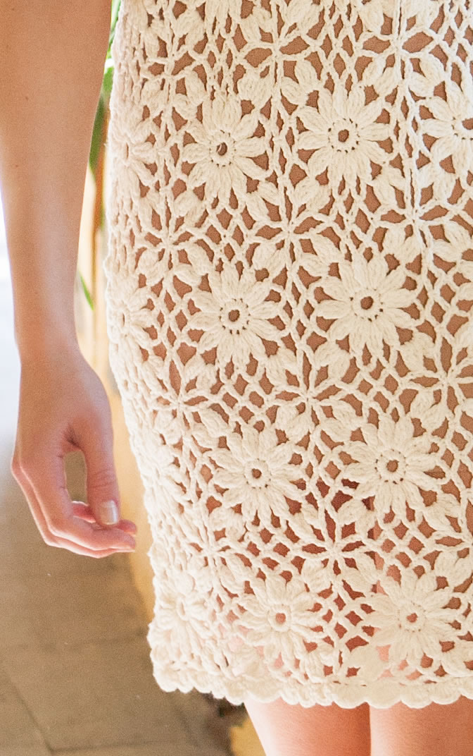 Миниплатье из цветочных мотивов, выполненных крючком, показывает в выгодном свете Ваши красивые ножки. С нижним платьем кремового цвета в нем можно смело отправиться на вечеринку в саду.