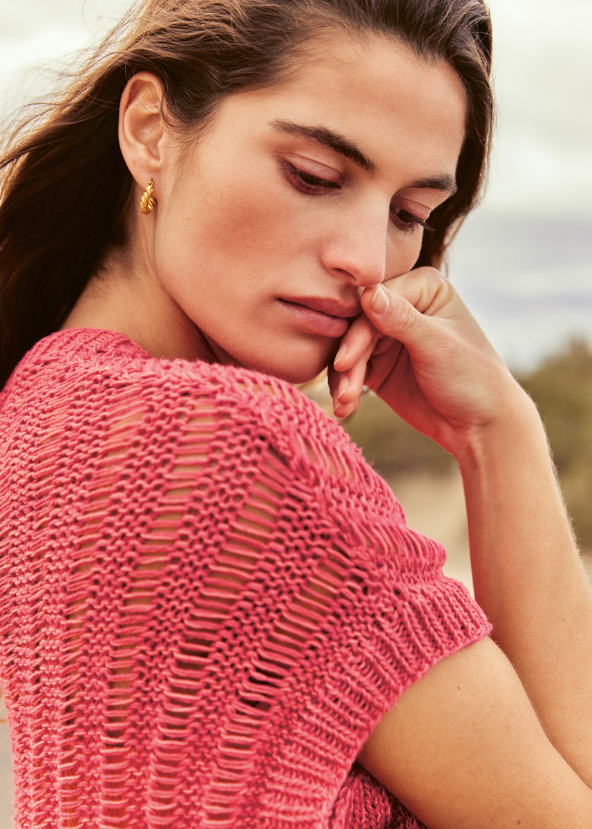 150 (200) г клубнично-красной (цв. 6) пряжи Linissimo (50% льна, 50% хлопка, 187 м/ 50 г) и 250 (300) г цвета розового фламинго (цв. 67) пряжи Solo Lino (80% льна восстановленного, 20% льна, 120 м/50 г) фирмы Lana Grossa; прямые спицы № 4 и № 5,5, круговые спицы № 4 длиной 40 и 60 см, крючок № 4.