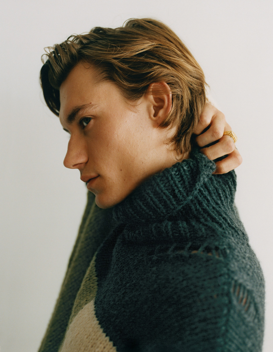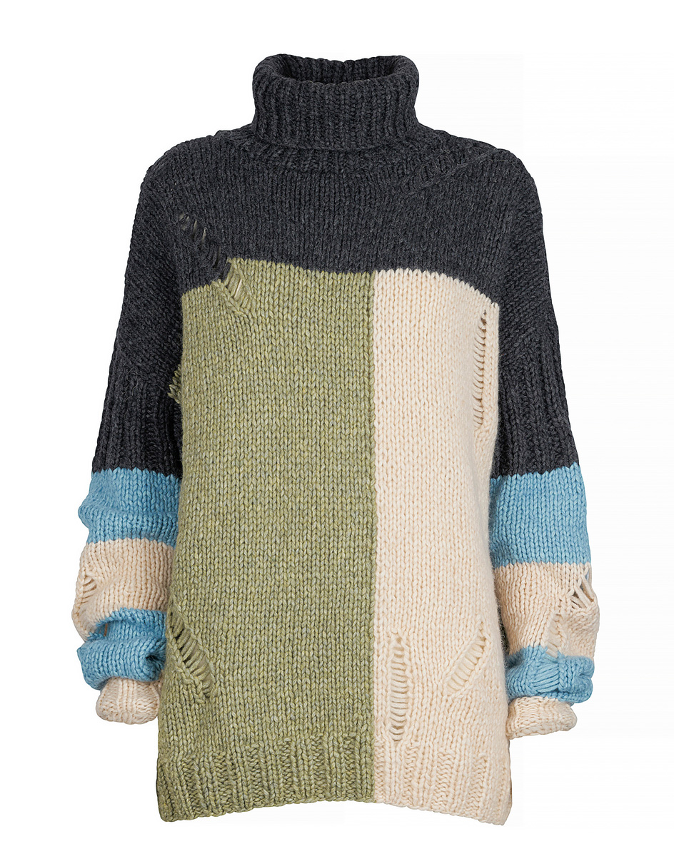 Lana Grossa-Qualität „Lala Berlin Lovely Cotton“ (75 % меринос, 25 % хлопок, длина нитки 90 m/50 g): ок. 300 г оливковый (цв. 3), ок. 200 г натуральный (цв. 7), ок. 150 г антрацит (цв. 8) и ок. 100 г зеленовато-голубой (цв. 1); сп. № 7 и 8, 1 кр. сп. № 7, 50 см длиной