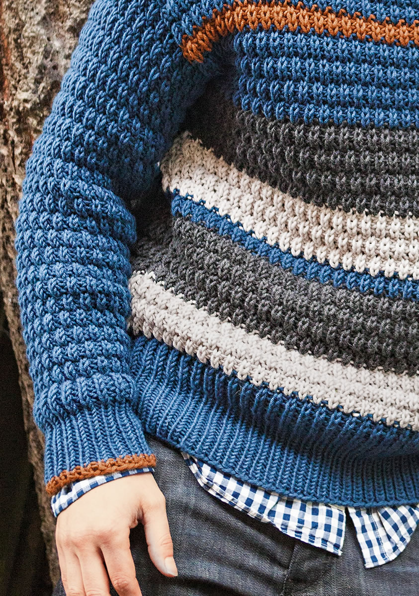 Пуловеры с широкими цветными полосами никогда не выйдут из моды. Придайте спортивной модели трендовую рельефную структуру, возьмите пряжу его любимых оттенков – и готов универсальный пуловер в интеллектуальном стиле, который будет уместен не только на отдыхе.