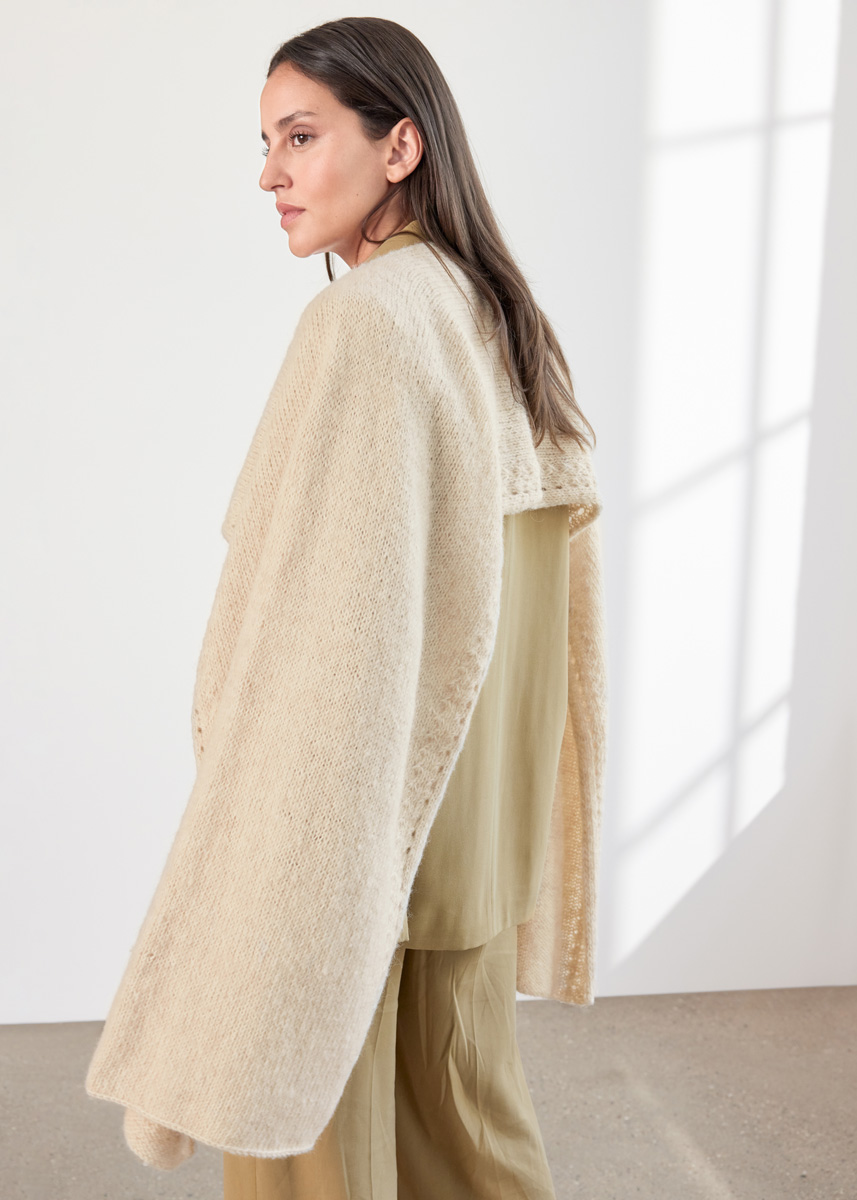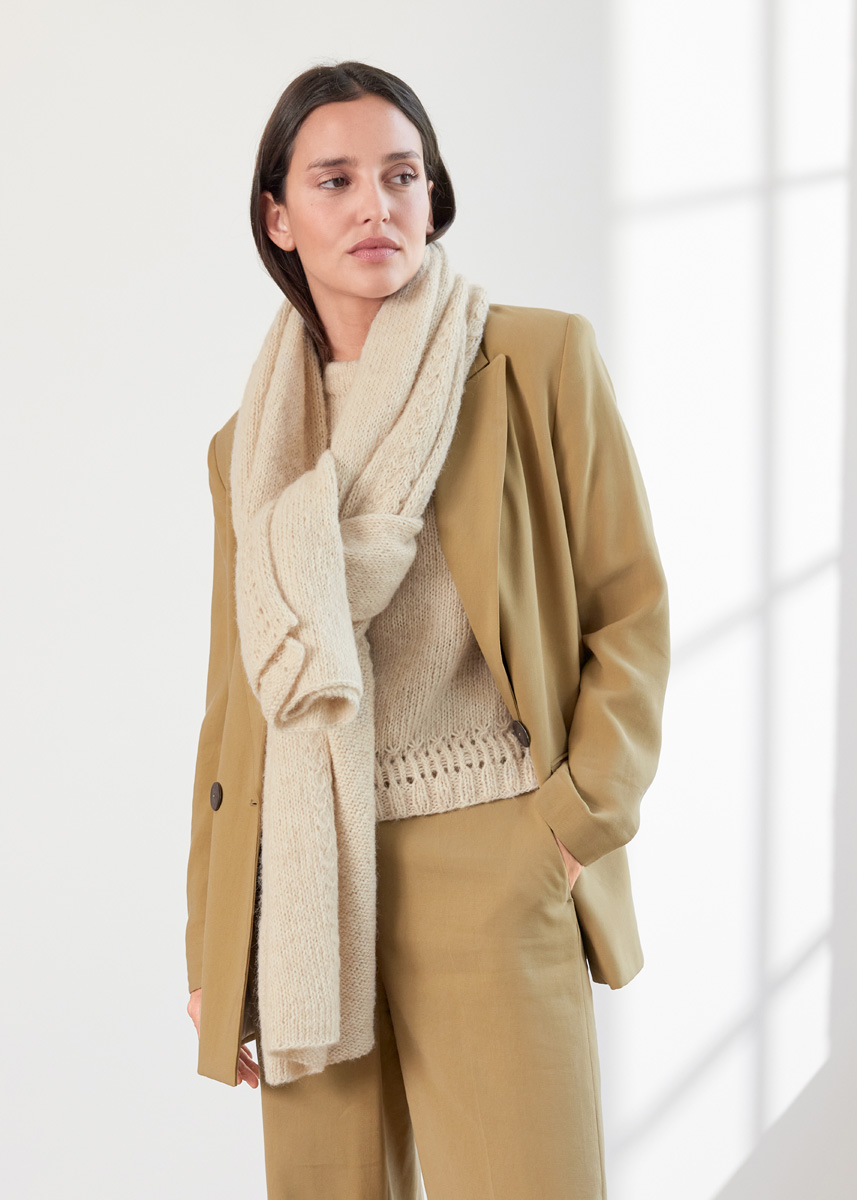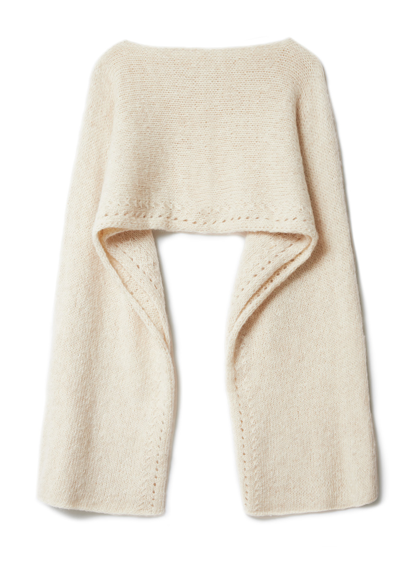 450 г белой суровой/ нежно-бежевой (цв. 5) пряжи Natural Alpaca Pelo (63% хлопка, 31% альпака бэби, 6% шерсти мерино, 125 м/50 г) фирмы Lana Grossa; прямые спицы № 6