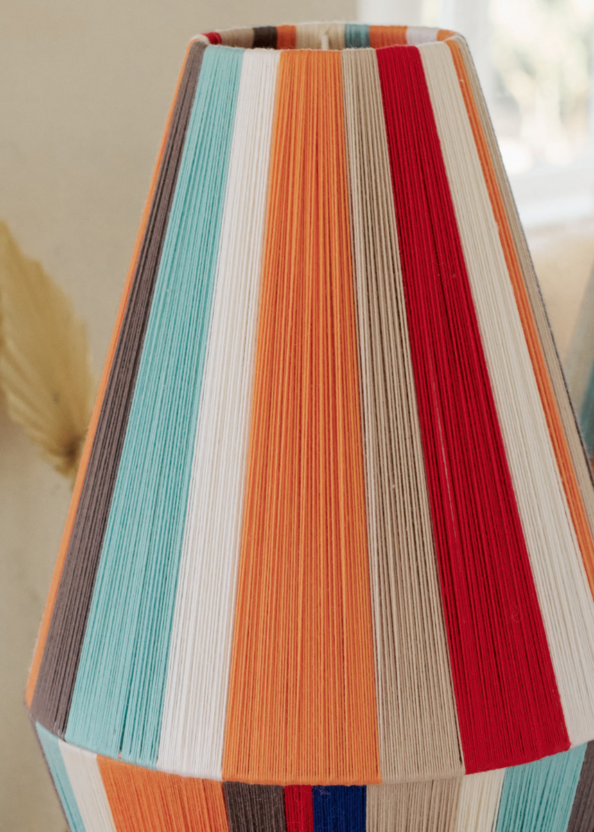 по 100 г цвета экрю (цв. 432) и мандариновой (цв. 418), по 50 г ярко-красной (цв. 417), бирюзовой (цв. 2020), серо-коричневой (цв. 558), бежевой (цв. 526), белой (цв. 431) и цвета морской волны (цв. 2099) пряжи Cool Wool (100% шерсти мерино экстрафайн, 160 м/50 г) фирмы Lana Grossa; 2 круглых каркаса для подвесного абажура конической формы высотой 31,5 см и диаметром от 30 до 12,5 см, тонкая двухсторонняя клей- кая лента.