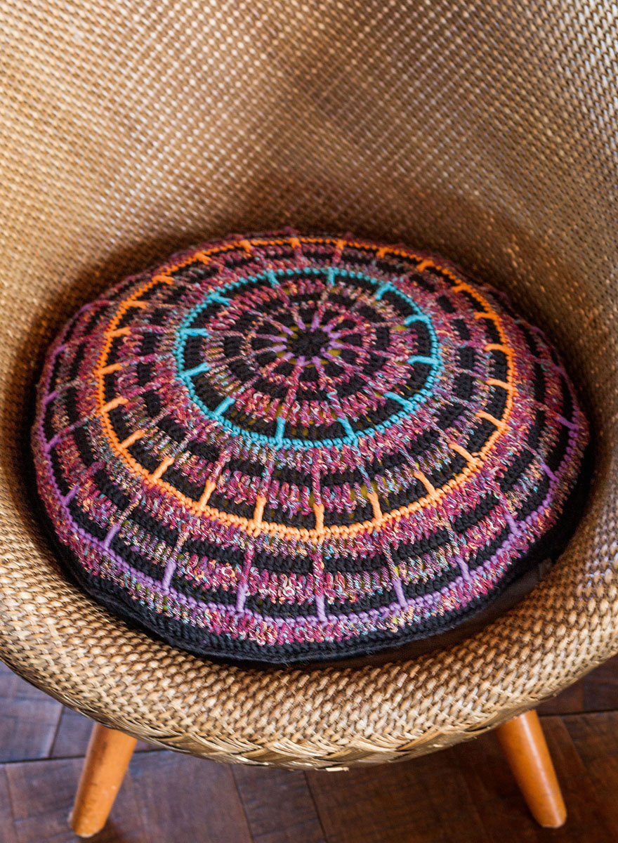 Lana Grossa-Qualität „Only Cotton” (100 % хлопок, длина нитки = ок. 110 м/50г): ок. 200 г черный (цв. 14), по 50 г оранжевый (цв. 16), фиолетовый (цв. 19) и аквамарин (цв. 22) и Lana Grossa-Qualität „Coco” (67 % хлопок, 33 % полиамид, длина нитки = ок. 115 м/50г): ок. 100 г бордо / бирюзовый / легко коричневый / фиолетовый (цв. 12); вязальный крючок № 4,5; 1 подушка, 50 см ø = подушка VARIO RUND, 50 см, Art. 30045 über www.kissenwelt.de