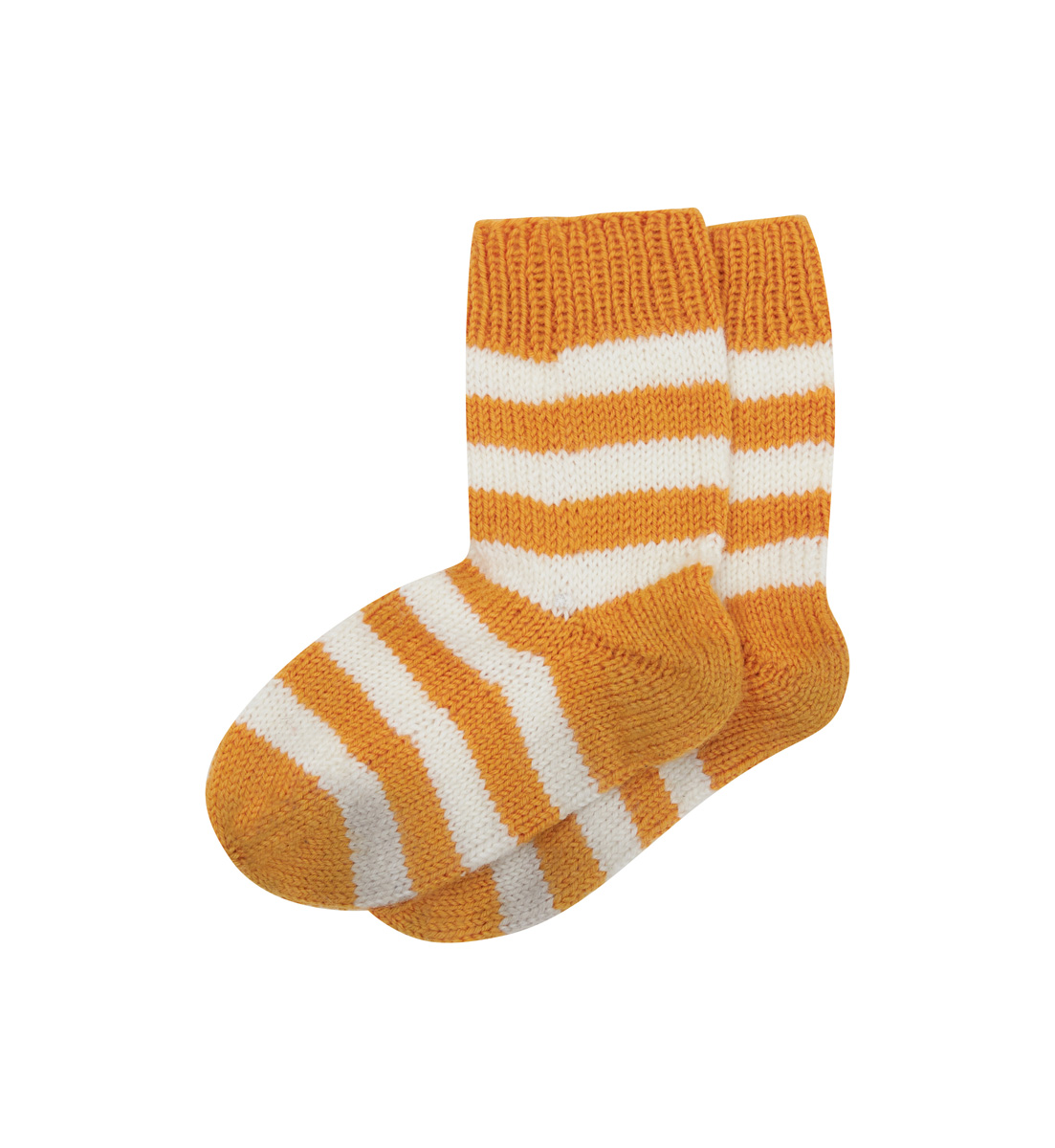 50 г цвета карри (цв. 1390) и 50 г белой суровой (цв. 1113) пряжи Meilenweit 50 (80% шерсти, 20% полиамида, 210 м/50 г) фирмы Lana Grossa; чулочные спицы № 3