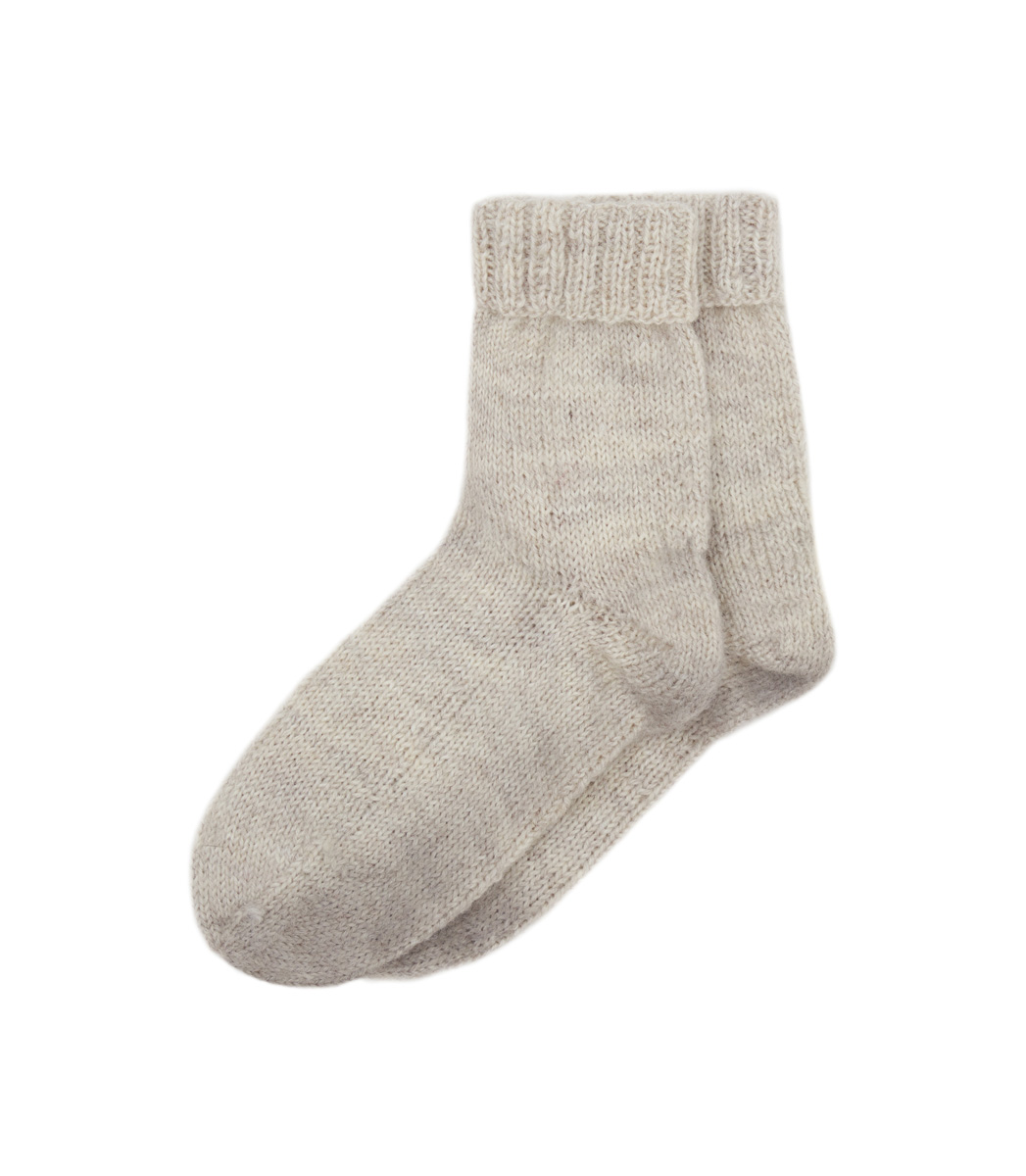 50 г светло-бежевой ме- ланжевой (цв. 1301) пряжи Meilenweit 50 (80% шерсти, 20% полиамида, 210 м/50 г) фирмы Lana Grossa; чулочные спицы № 3