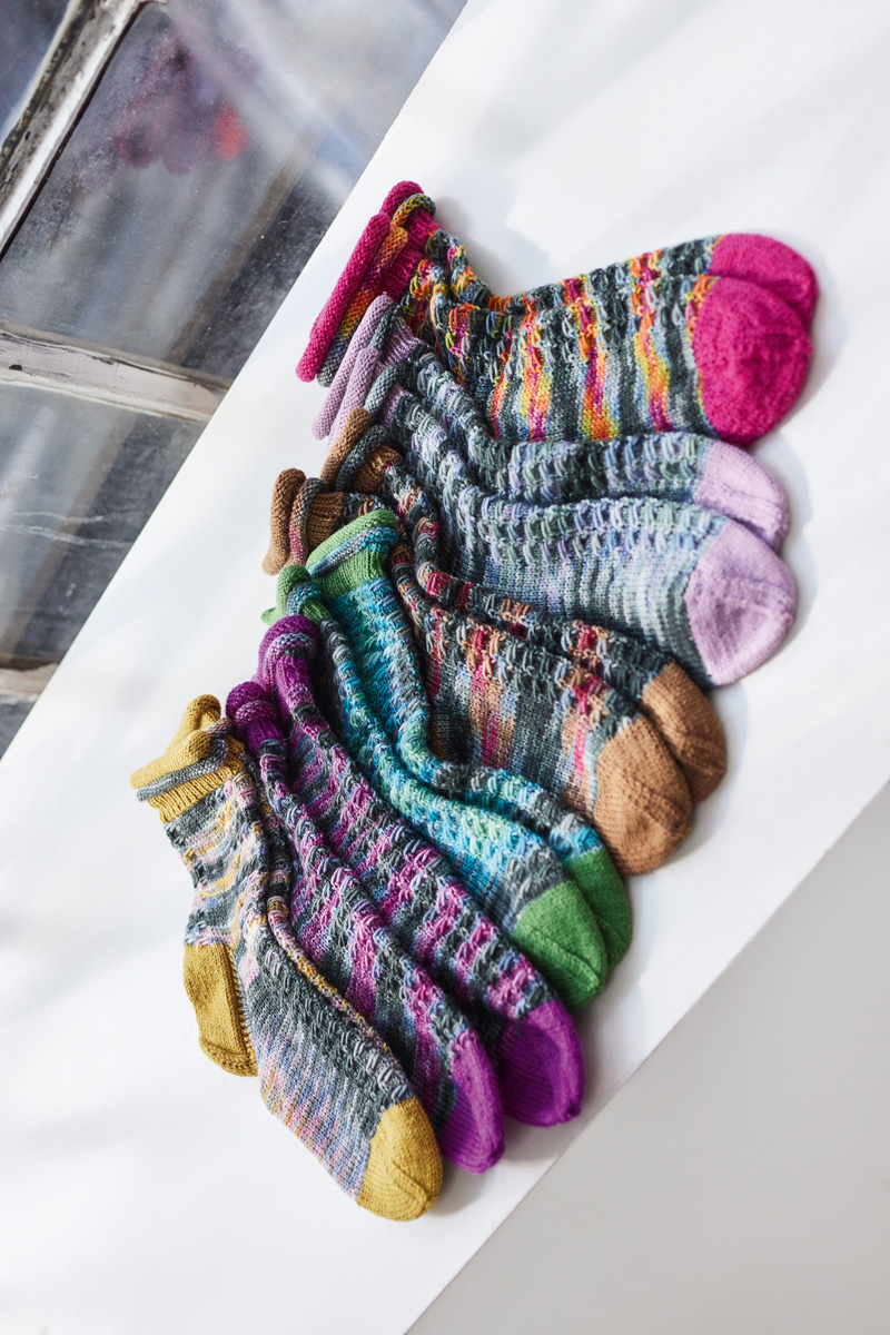 100 г цвета Anuj (цв. 614) пряжи Meilenweit 100 Merino new effects hand-dyed (80% овечьей (мериносовой) шерсти, 20% полиамида, 420 м/100 г) и 100 г горчично-желтой (цв. 2418) пряжи Meilenweit 100 Merino extrafine (75% овечьей (мери- носовой) шерсти, 25% полиамида, 420 м/100 г); 2 набора чулочных спиц № 2,5