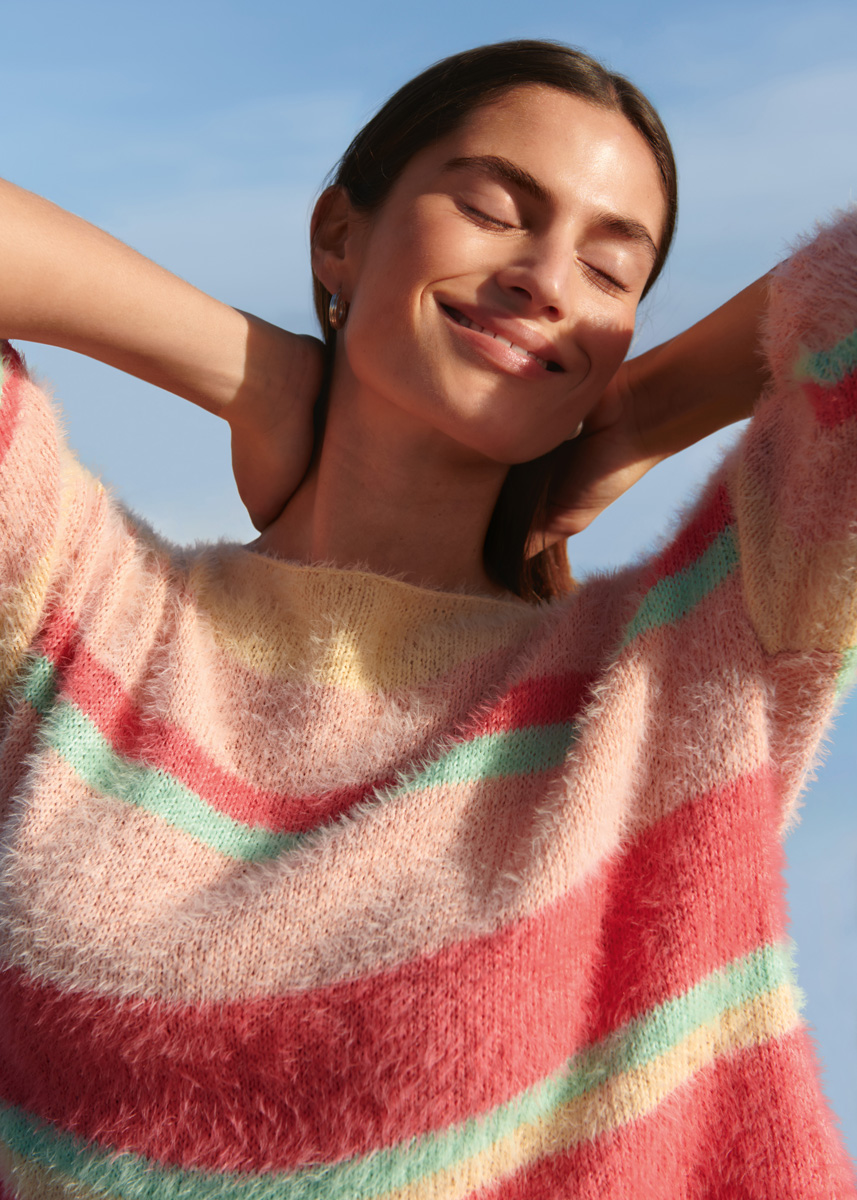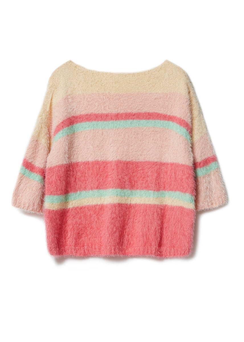 150 (150–200–200) г цвета мякоти арбуза (цв. 54), 150 (150– 200–200) г светло-розовой (цв. 53), 100 (100–100–150) г персиковой (цв. 52), 50 (50–50–100) г нежно-зеленой (цв. 48) пряжи Per Fortuna (74% хлопка эко, 26% полиамида, 190 м/50 г) фирмы Lana Grossa; прямые спицы № 4,5