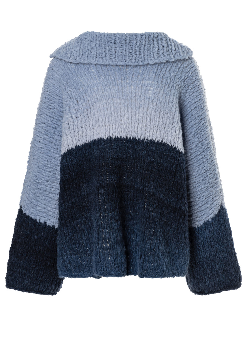 по 150 (150–200) г тем- но-синей (цв. 11) и светлой серо-синей (цв. 12) пряжи Lala Berlin Cloudy (93% шерсти мерино экстрафайн, 7% нейлона, 100 м/50 г) фирмы Lana Grossa; прямые спицы № 8, кру- говые спицы № 8 длиной 50 см