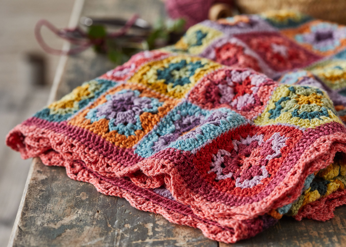 Lana Grossa-Qualität „Landlust Sommerseide“ (50% шёлк, 50% хлопок, длина нити 170 m/50 g), по 100 г бирюзовый (цв 23), мягко-зеленый (цв 3), темно зелёный (ц 4), светло жёлтый (цв 19), золотисто-жёлтый (цв 18), оранжевый (цв 10), красный (цв 11), тёмно-фиолетовый (ц 21), пурпурный (цв 15) и сирень (цв 22) и по 150 г цикламеновый (цв 12) и красный/розовый | (цв 20); 1 крючок № 3,5