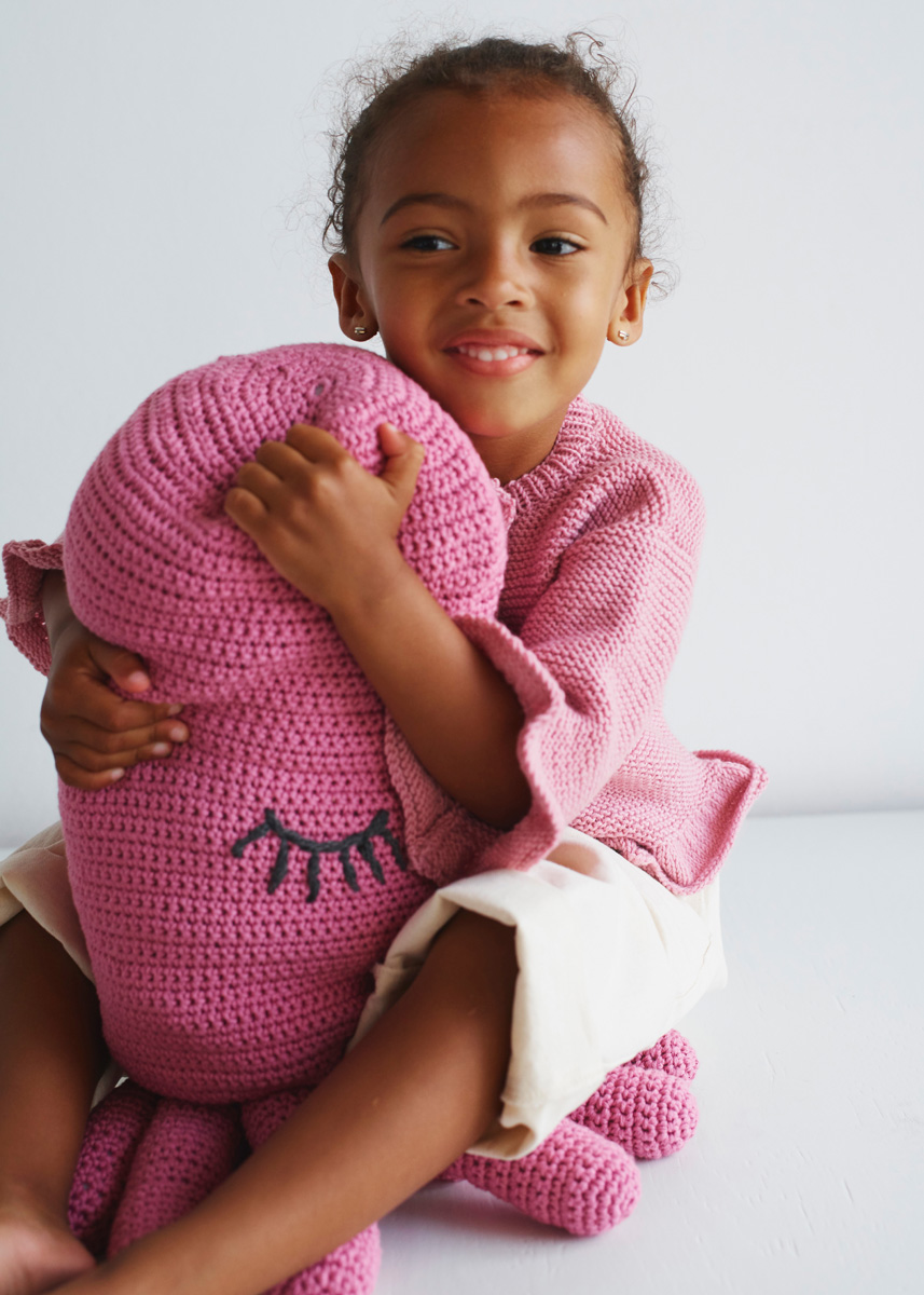 300 г цвета эрики (цв. 127) и остаток темно-серой пряжи Organico (100% биохлопка, 90 м/50 г) фирмы Lana Grossa; крючок № 3,5, игла с тупым концом; 350 г ватки для набивки