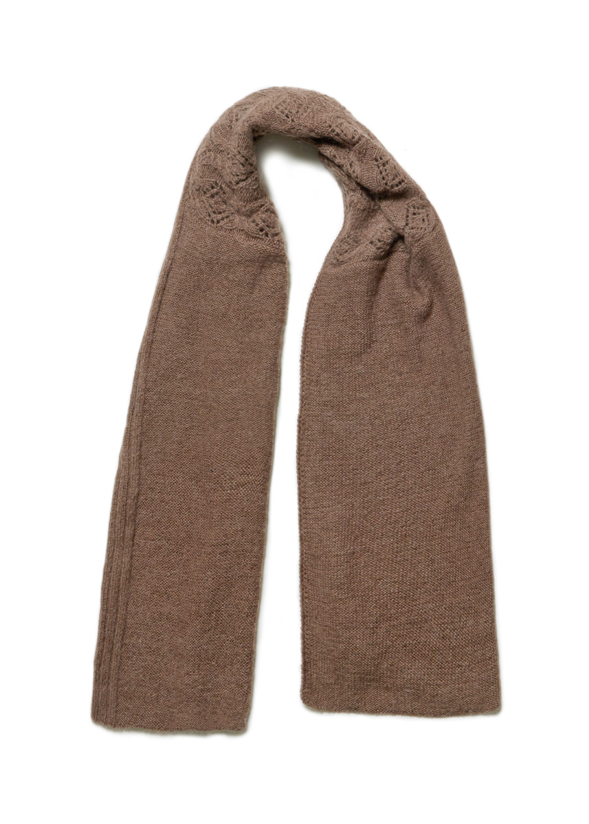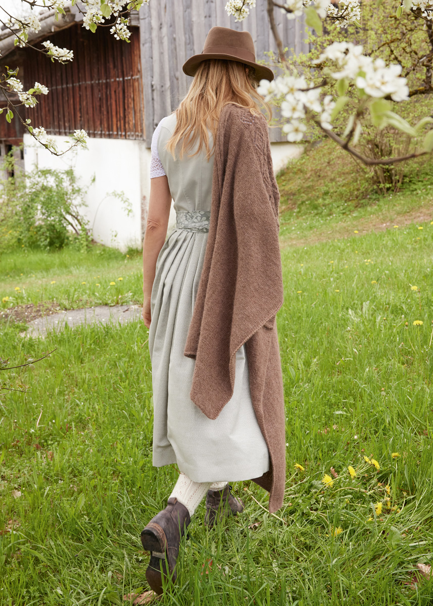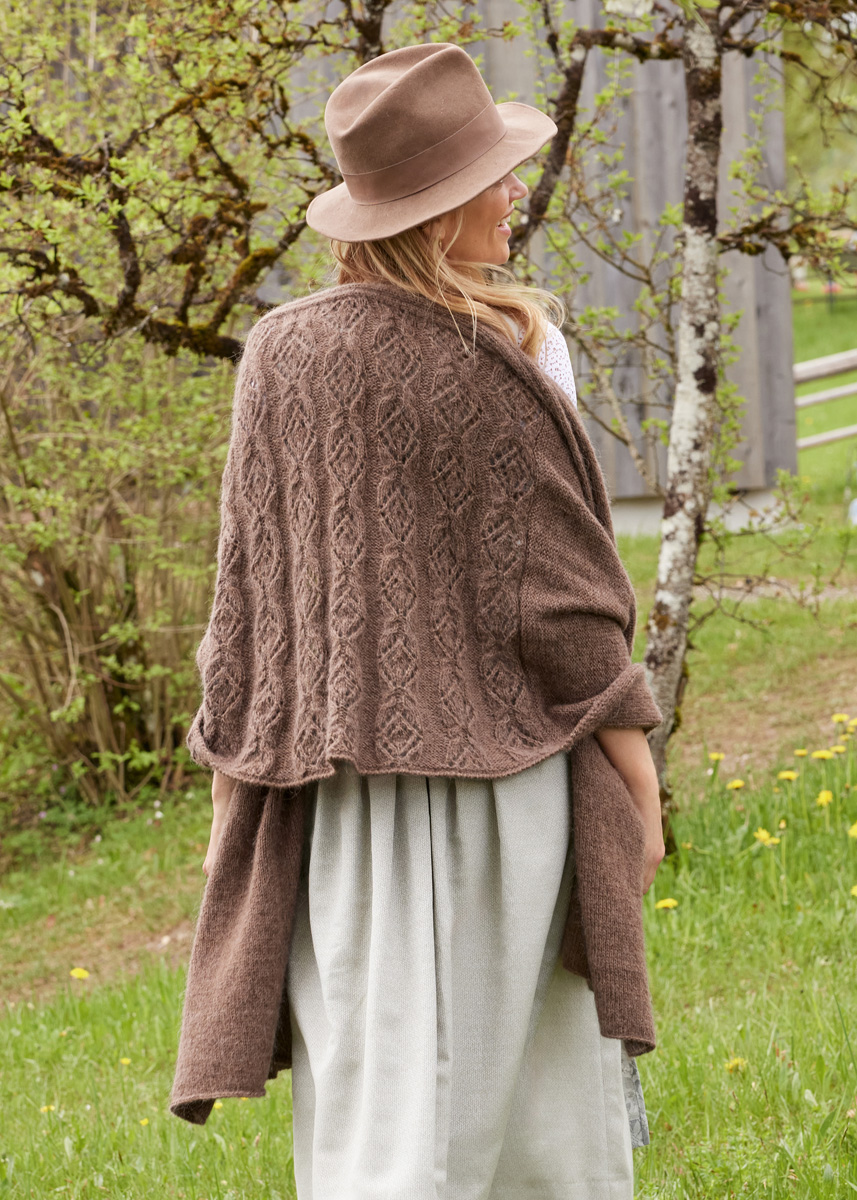Lana Grossa Ecopuno (72% хлопок, 17% шерсть (меринос), 11% альпака (беби), длина нити 215 m/50 g), 350 г темно коричневый (цв 17) и Lana Grossa Setasuri (69% альпака (Suri), 31% шёлк, длина нити 212 m/25 g), 175 г нуга (цв 4); сп. № 4 и 1 крючок № 3,5.