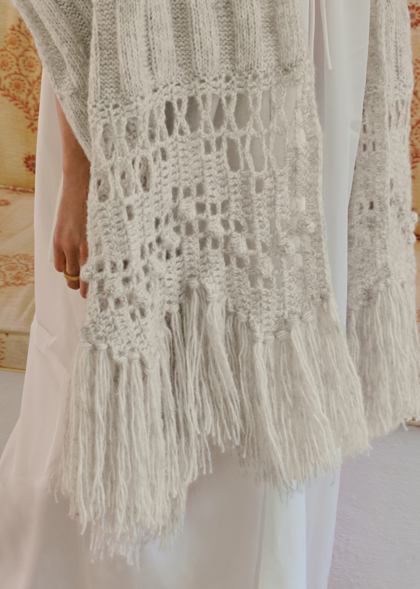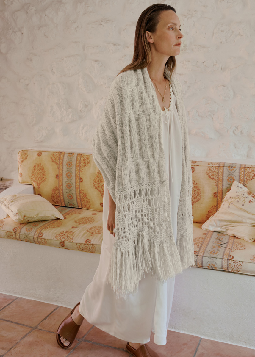 350 г белой суровой/ нежно-серой (цв. 2) пряжи Natural Alpaca Pelo (63% хлопка, 31% альпака бэби, 6% шерсти мерино, 125 м/50 г) фирмы Lana Grossa; прямые спицы № 6, крючок № 6 и № 8 (для привязывания кистей).
