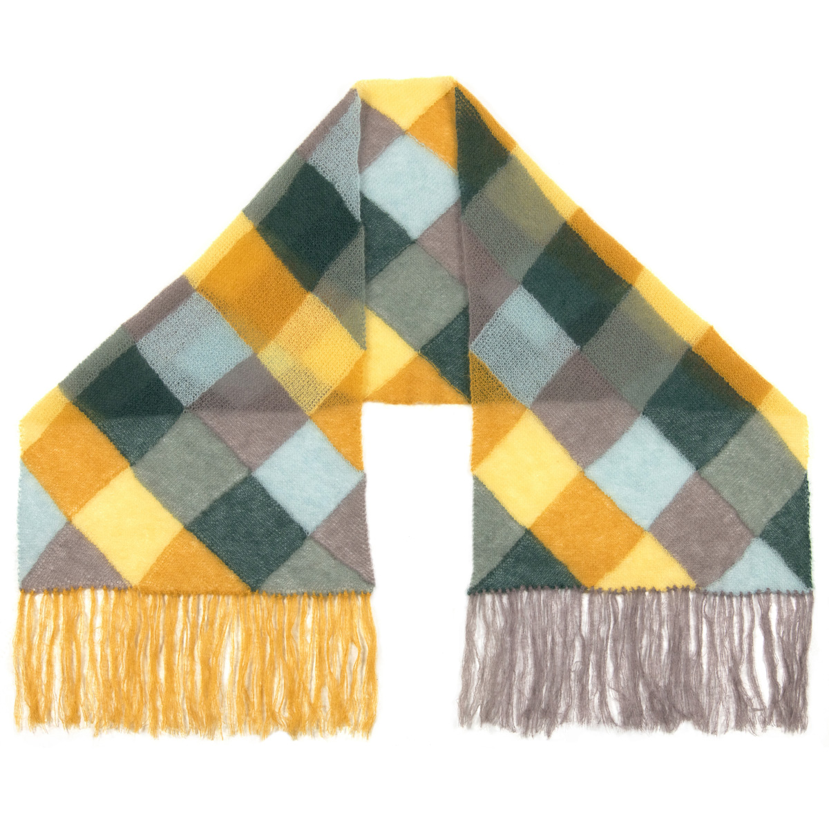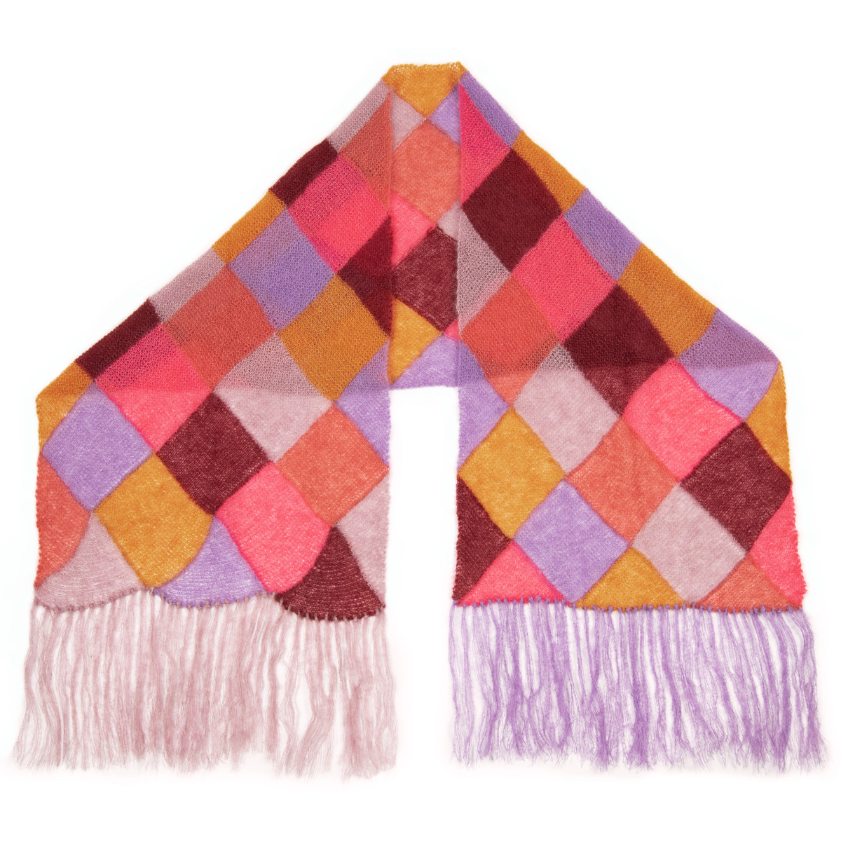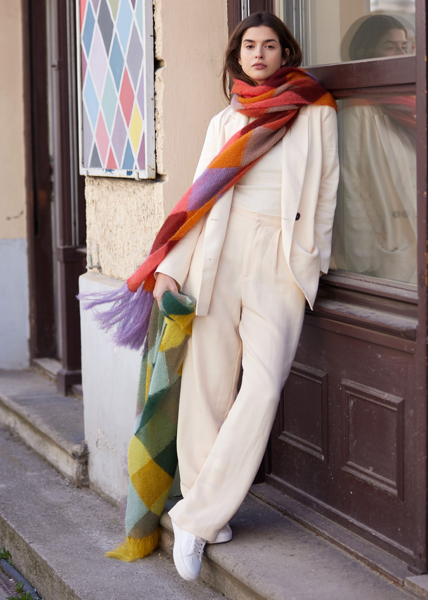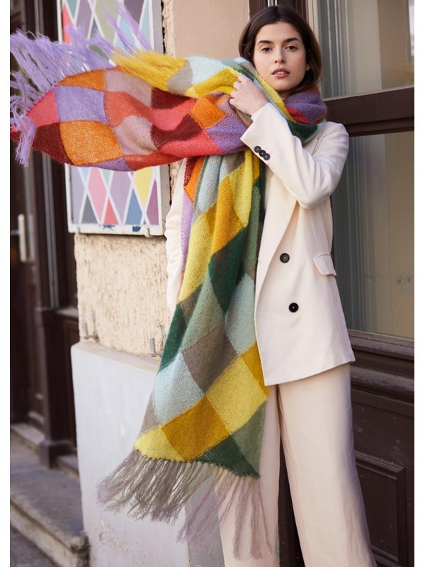 Lana Grossa Silkhair (70% мохер (суперкид), 30% шёлк, длина нити 210 m/25 g), 16a: 50 г ветхо-розовый (цв 174), 50 г лавандовый (цв 163), 25 г бордо (цв 113), 25 г кирпично-красный (цв 164), 25 г мандариновый (цв 161) и 25 г малина (цв 70); 16b: 50 г серо-коричневый (цв 35), 50 г кари (цв 160), 25 г серо зелёный (цв 105), 25 г мята (цв 175), 25 г жёлтый (цв 158) и 25 г темно зелёный (цв 110); сп. № 4,5, 3 маркировки, 1 крючок № 4,5–5 для бахромы