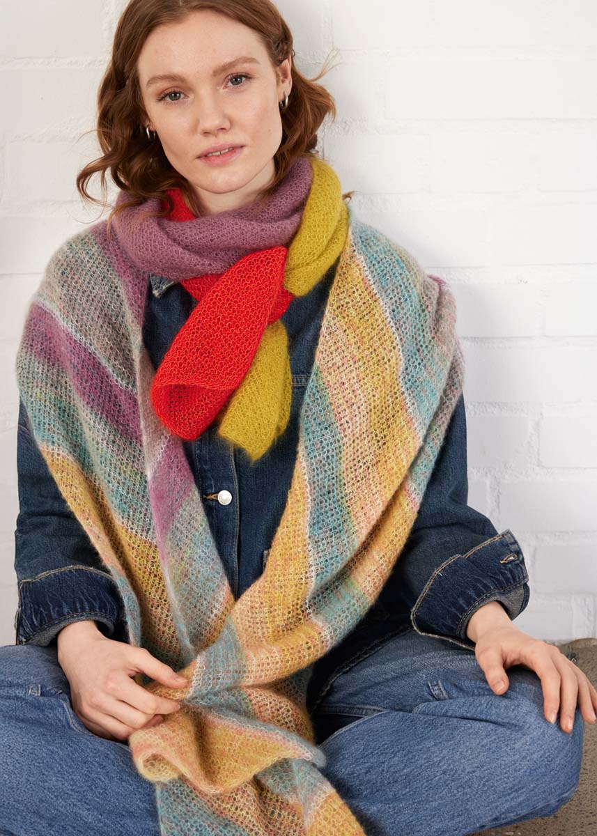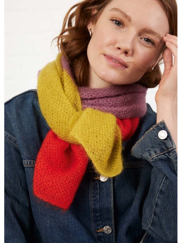 Lana Grossa Silkhair (70% мохер (суперкид), 30% шёлк, длина нити 210 m/25 g), по 25 г лайм (цв. 218), мальва (цв. 216) и светящийся красный (цв. 215); кр. сп. № 4,5.