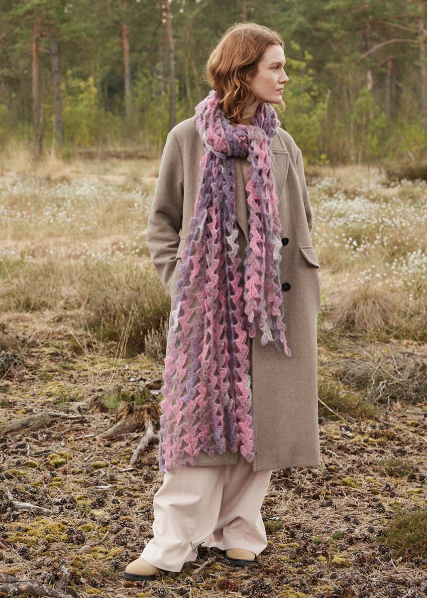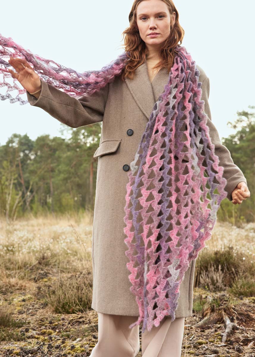 Lana Grossa Silkhair Print (70% мохер (суперкид), 30% шёлк, длина нити 210 m/25 g), 175 г в пинк/бордо/ светло-серый/серо-фиолетовый (цв. 435); 1 крючок № 4,5