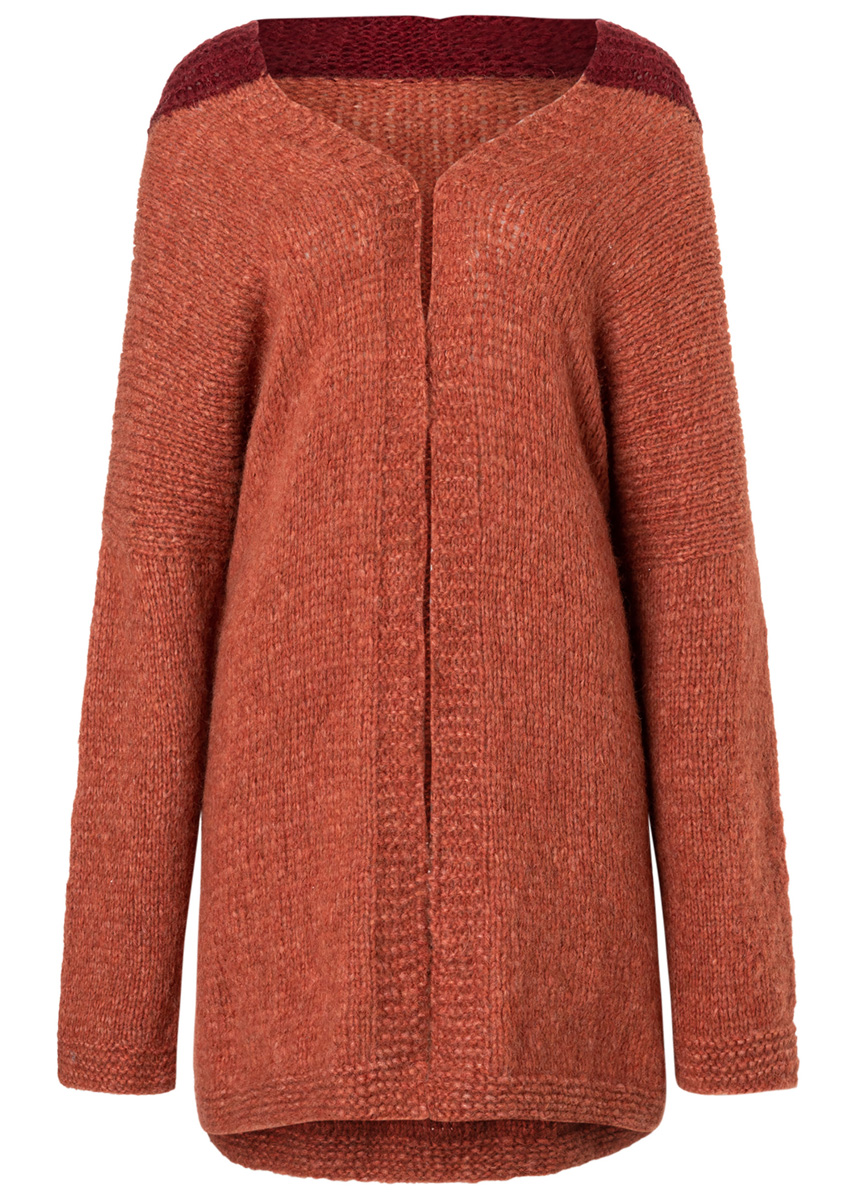 400 (450–500) г цвета ржавчины (цв. 20) и 100 г темно-красной (цв. 10) пряжи Alpaca Moda (74% альпака бэби, 13% шерсти мерино, 13% полиамида, 135 м/50 г) фирмы Lana Grossa; прямые спицы № 6 и № 7, круговые спицы № 7.