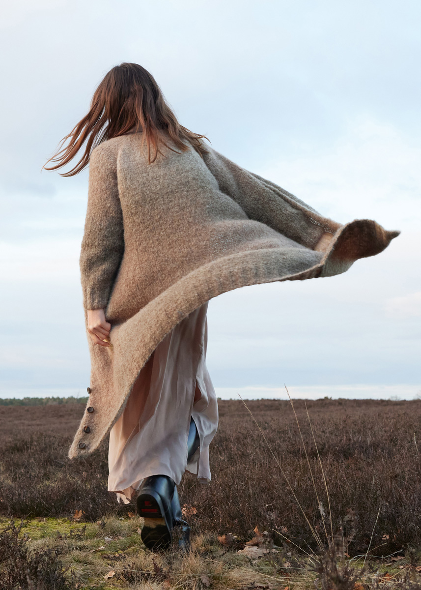 Lana Grossa-Qualität „Avio“ (63 % альпака (Fine), 37 % полиамид, длина нити = ca 150 m/50 g): ок 400 (400– 450–450) г бежевый/серо-коричневый (цв 4); сп. № 4,5 и 5,5; 9 коричневые пуговицы, ок 22 мм