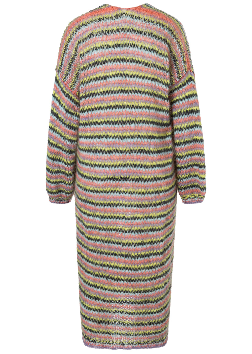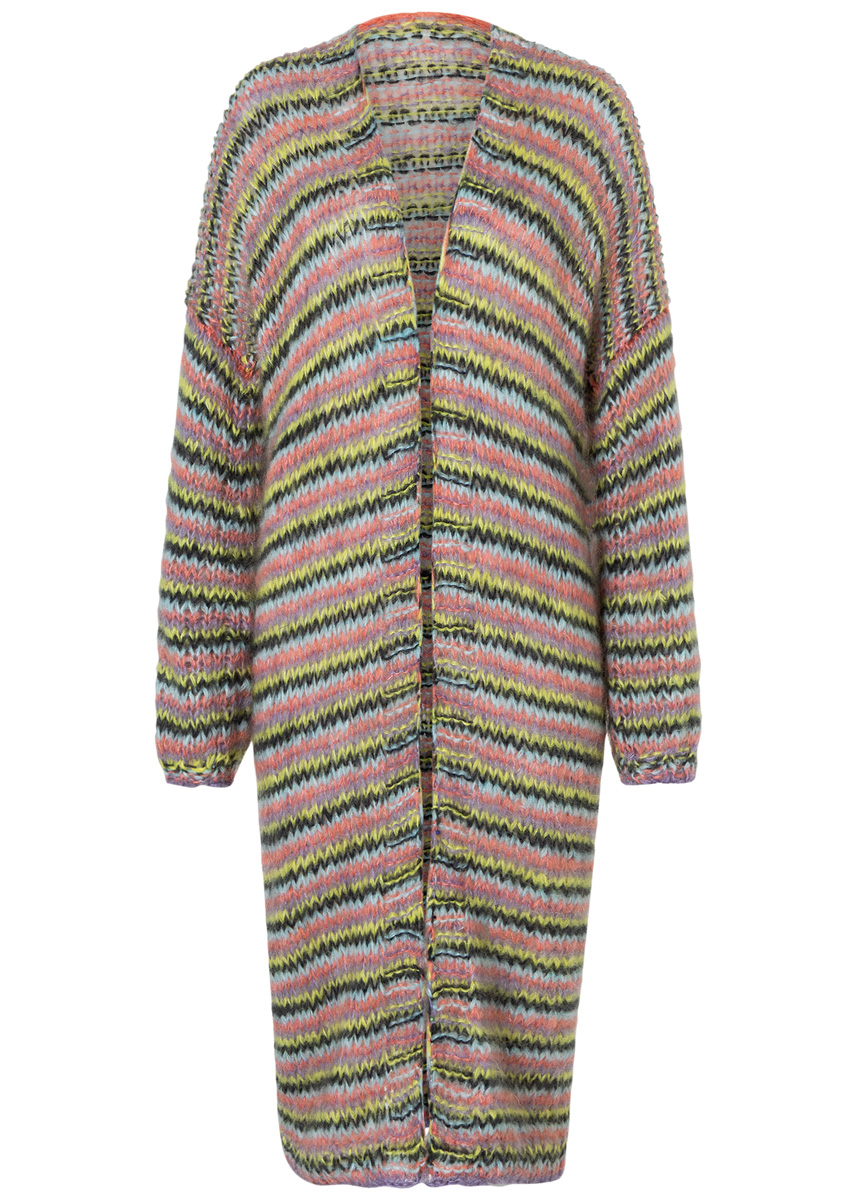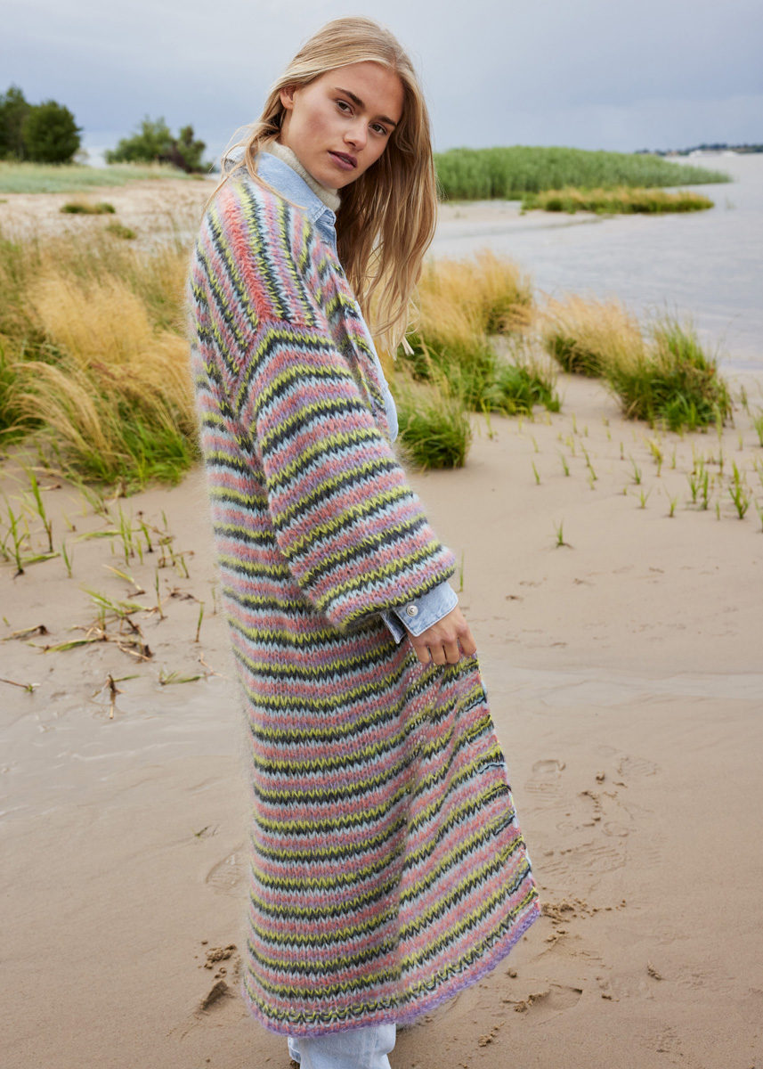 75 (100–125) г лиловой (цв. 6), 75 (100–125) г лимонно-желтой (цв. 39), 75 (100–125) г цвета антрацита (цв. 11), 75 (100–125) г зеленовато-голу- бой (цв. 51) и 75 (100–125) г желто-розо- вой (цв. 3) пряжи Brigitte No. 3 (57% шерсти мерино экстрафайн, 20% мохера суперкид, 23% полиамида, 100 м/25 г) фирмы Lana Grossa; круговые спицы № 8 и № 9 длиной 80 см
